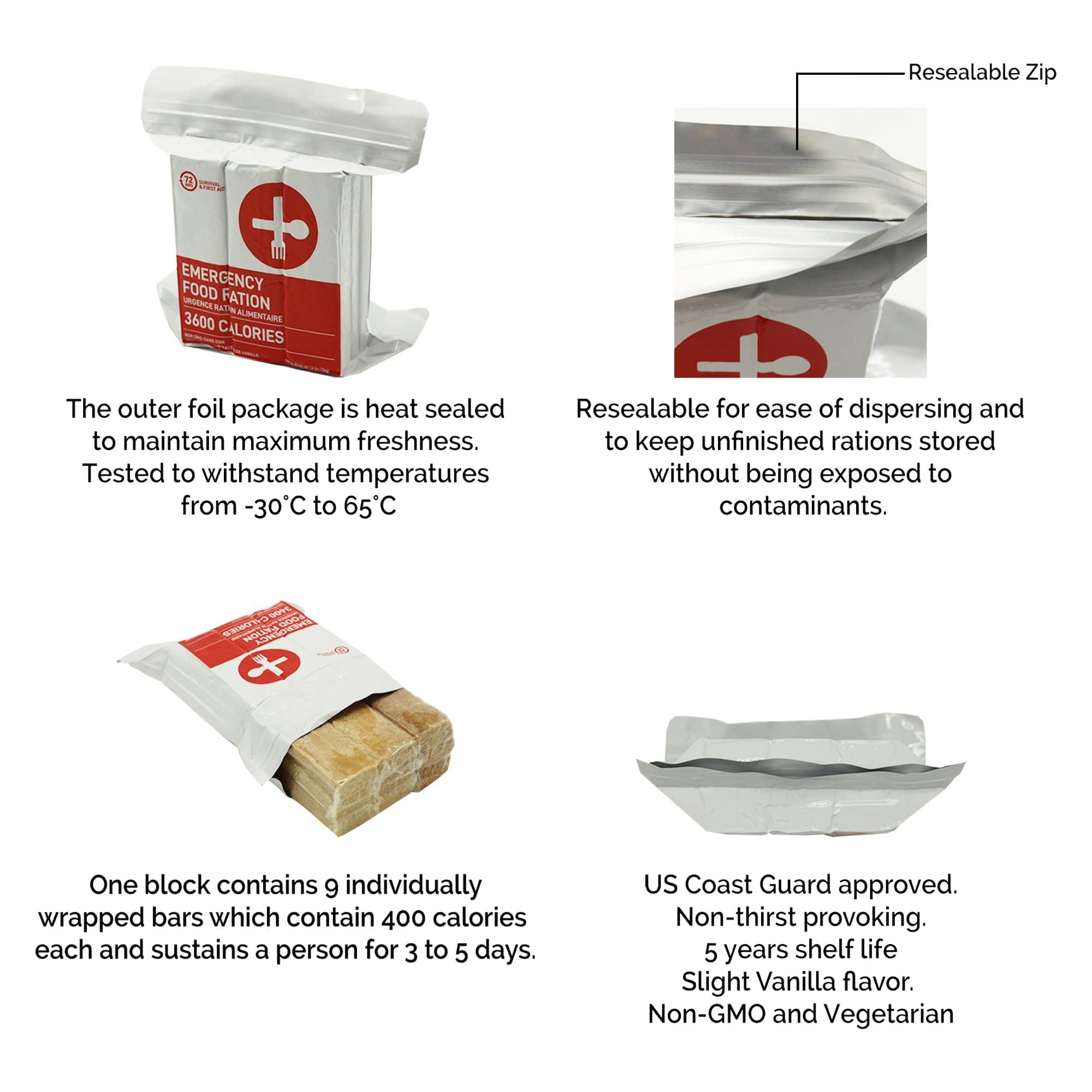 Up to 5-year shelf life, 5 Day Supply of Food, Canadian coast guard anDatrex Transport Canada approved, made in the US.