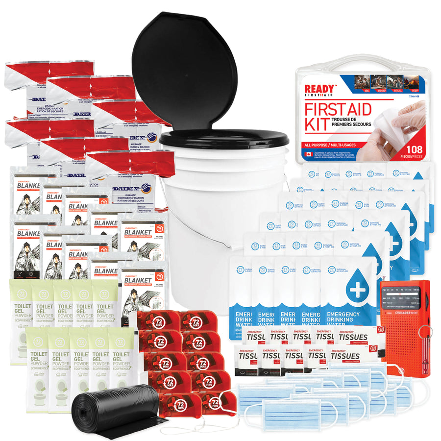 10 Person Essential Kit for families, workplaces, or organizations. Contains essential emergency supplies such as food, water, light, blankets, and more.