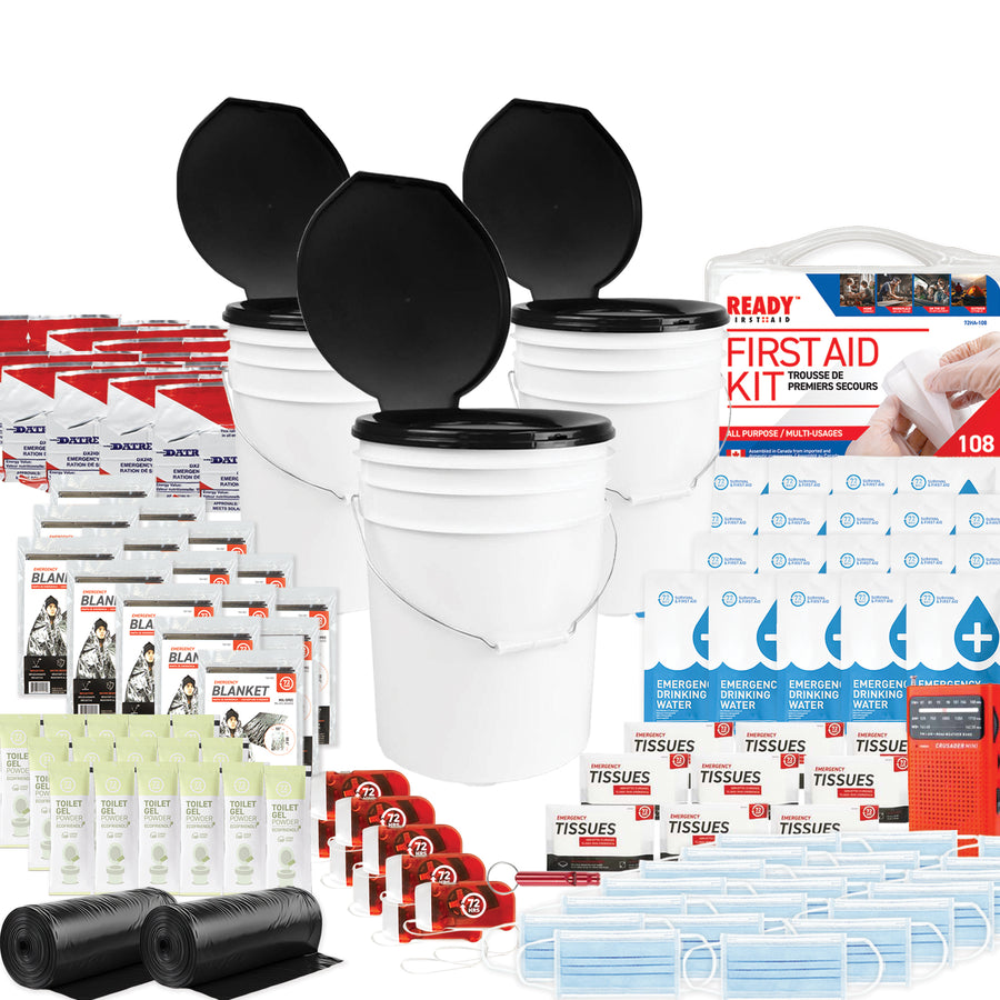 30 Person Essential Kit for workplaces or organizations. Contains essential emergency supplies such as food, water, light, blankets, first aid kits, and more.