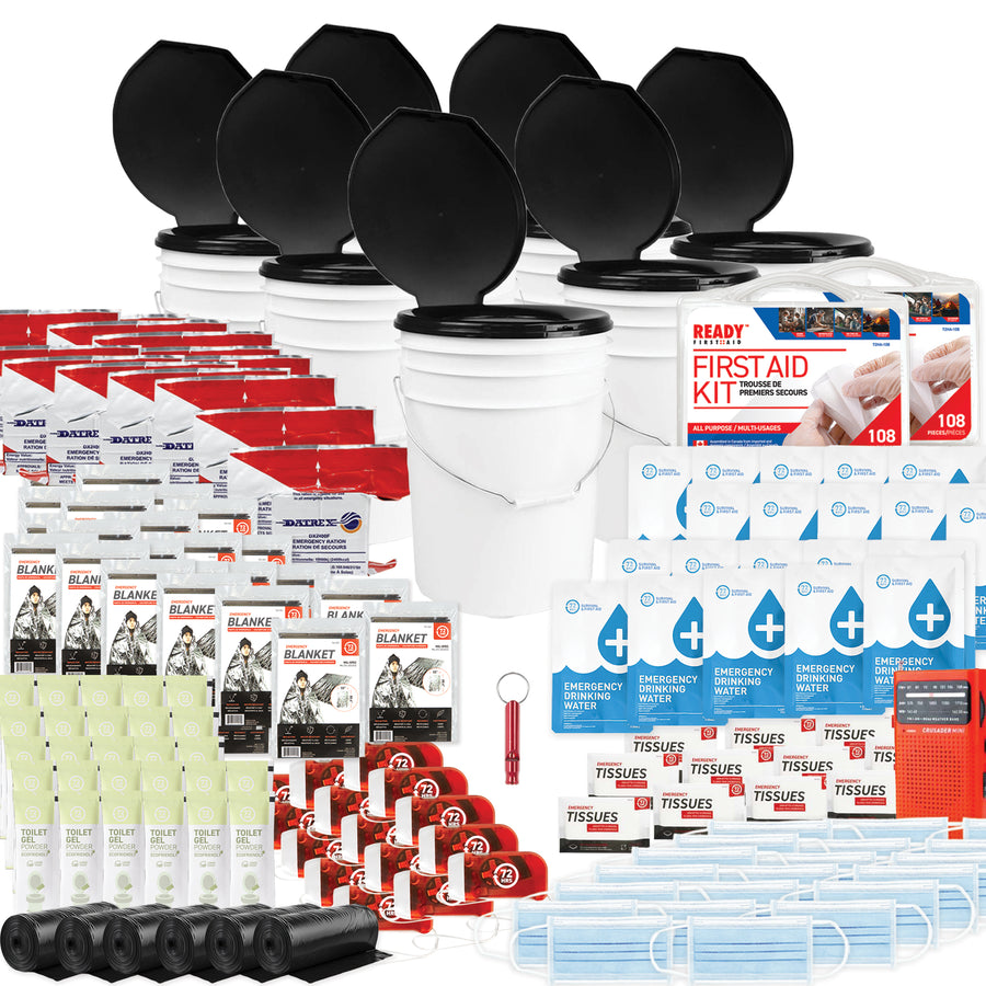 90 Person Essential Kit for workplaces or organizations. Contains essential emergency supplies such as food, water, light, blankets, first aid kits, and more.
