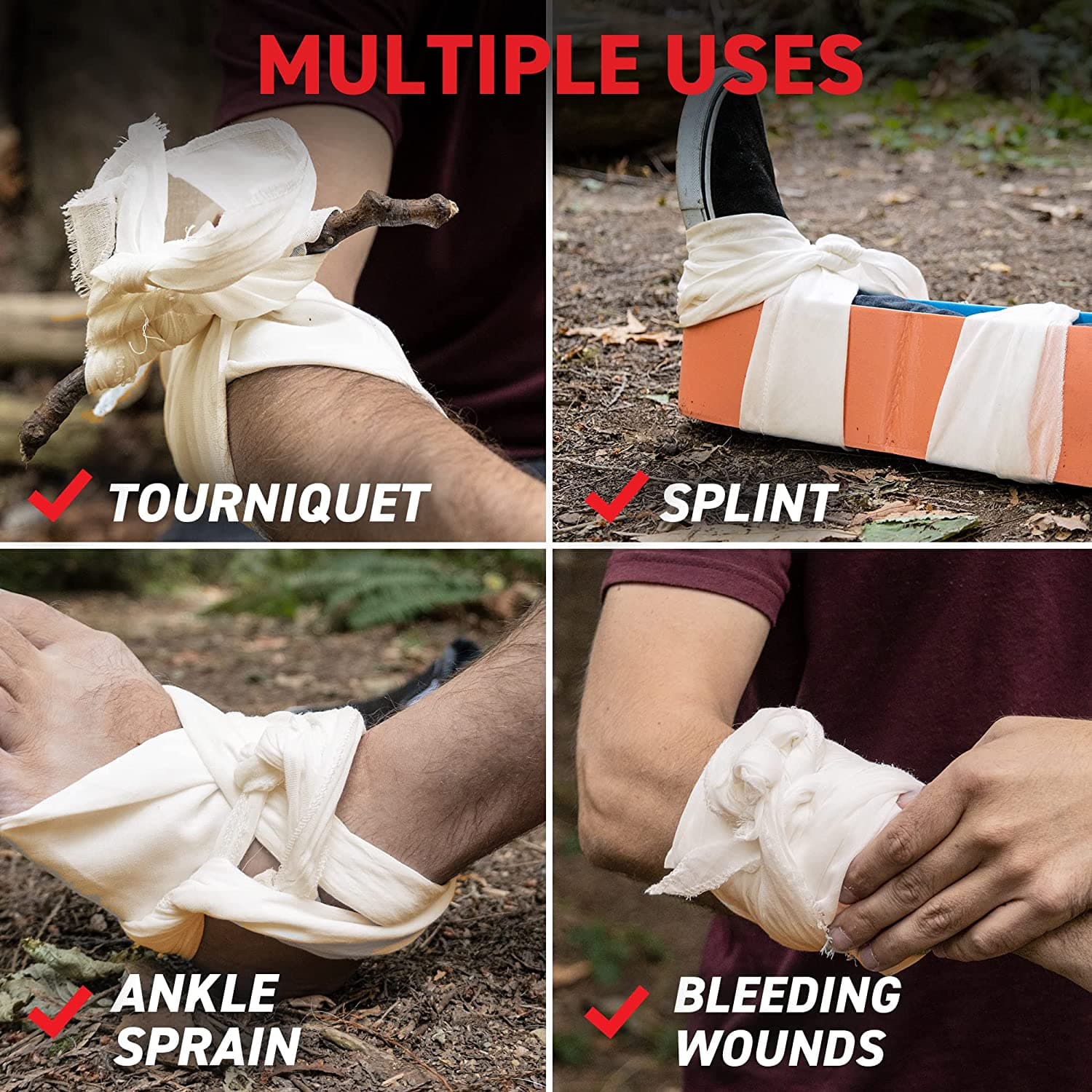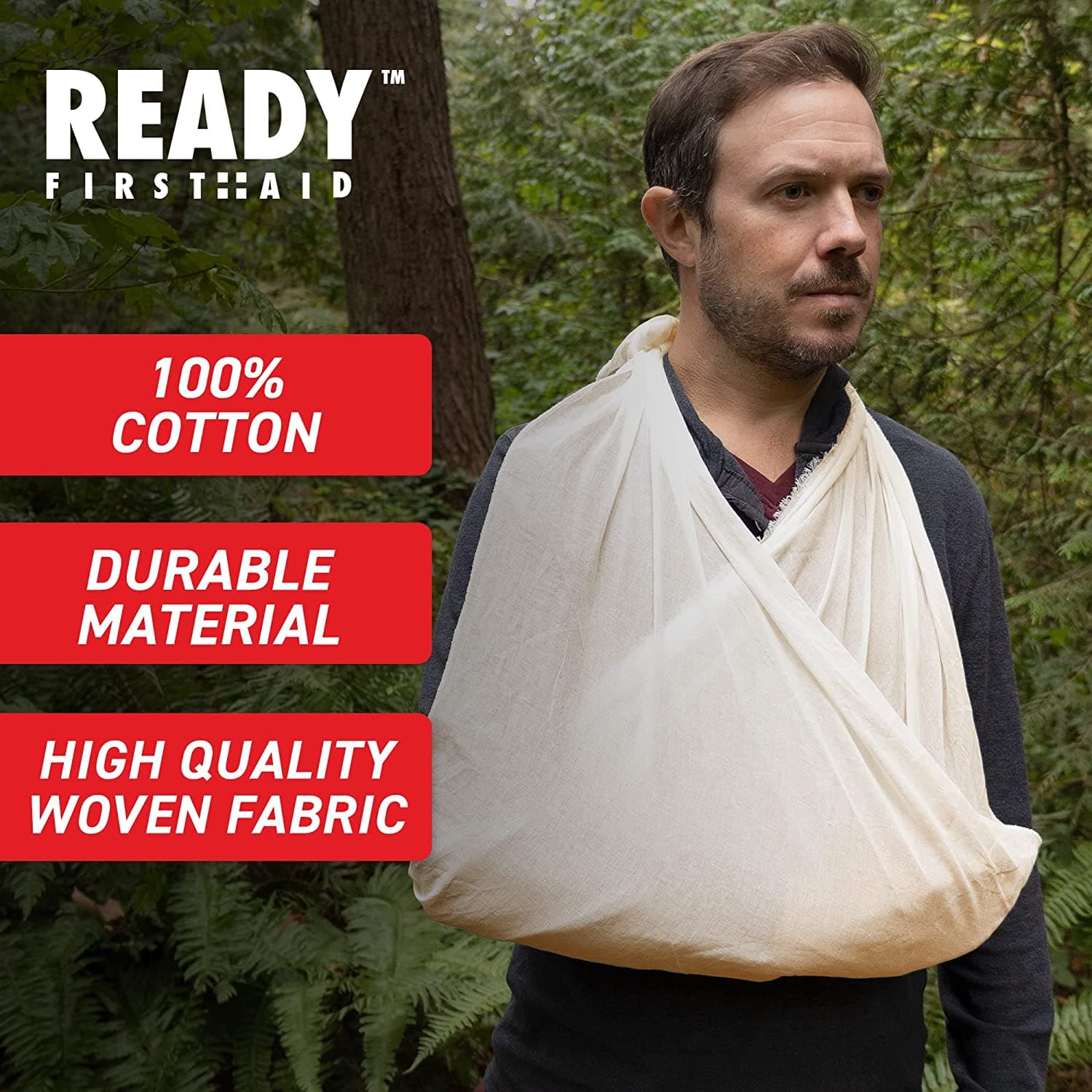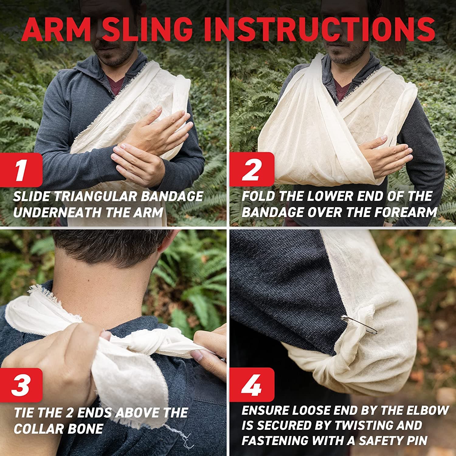 Triangular bandage is also known as a triangle sling and is considered one of the most versatile bandages in the first aid kit. While it is not sterile and is recommended not to use on open wounds, there is a multitude of other uses for the bandage. Triangular bandages can be used to maintain compression, keeping body parts stationary during the healing process, splinting broken bones, holding the gauze in place, and even stopping or preventing bleeding.