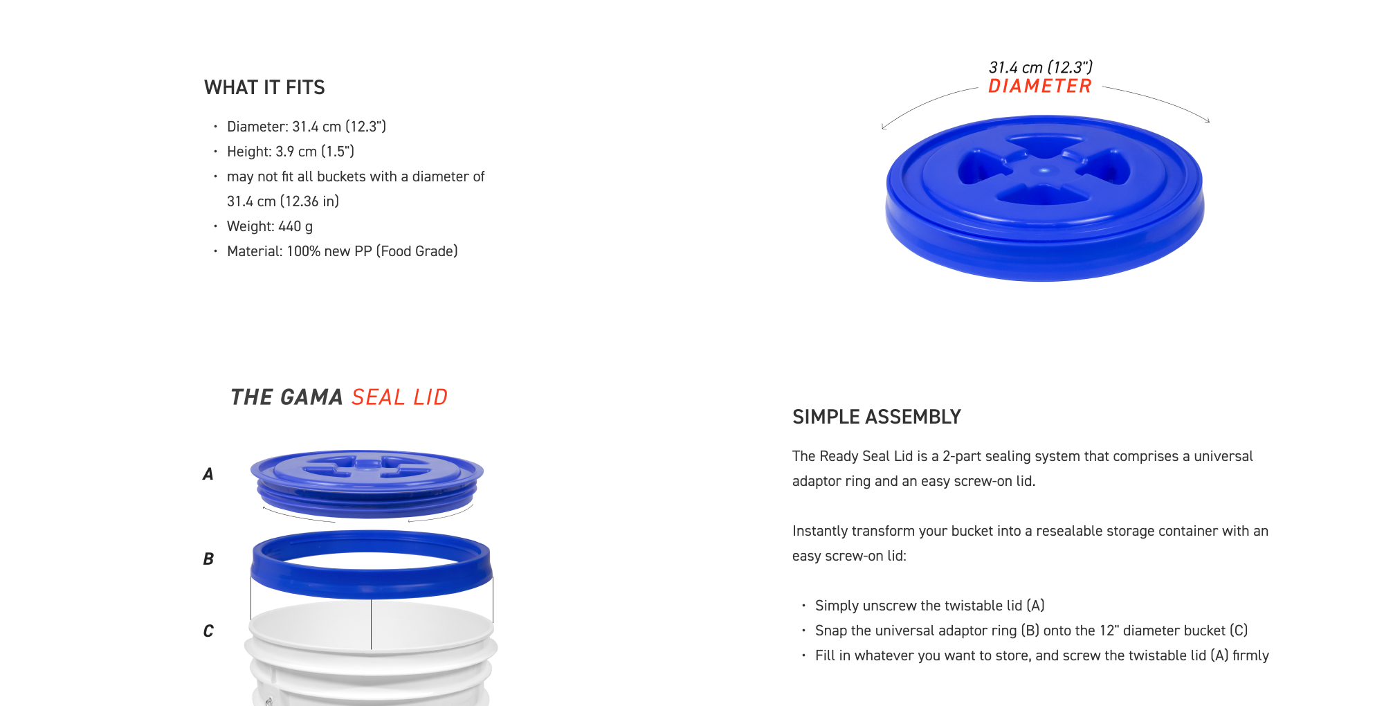 Ready Seal Lids are Food Grade (FDA 21 CFR 177.1520) and come in a range of different colours. Perfect for long-term food storage, storing dry pet food, household items, cleaning supplies, composting, and camping.
