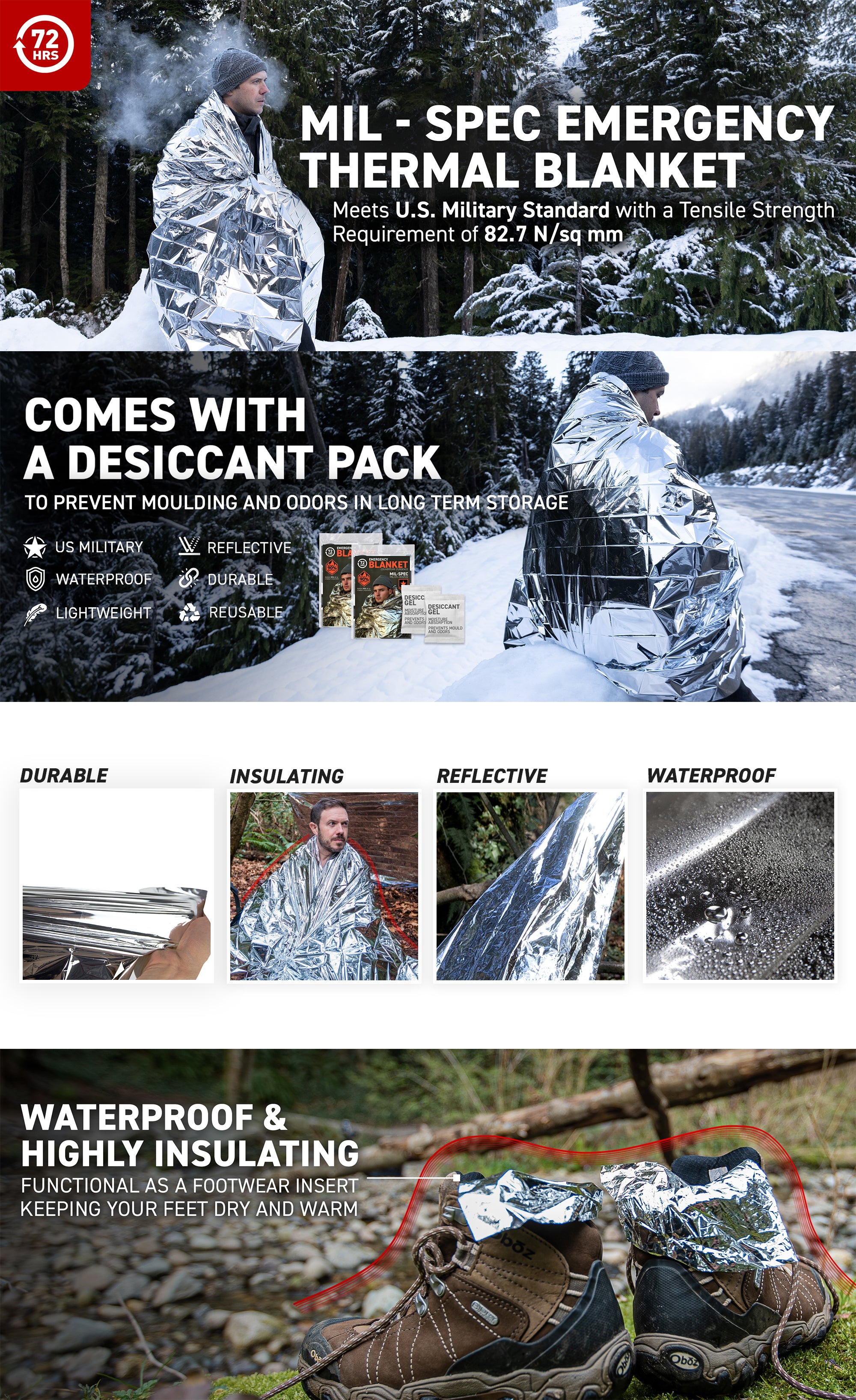 72HRS Extra Large MIL-SPEC Emergency Mylar Thermal Blanket