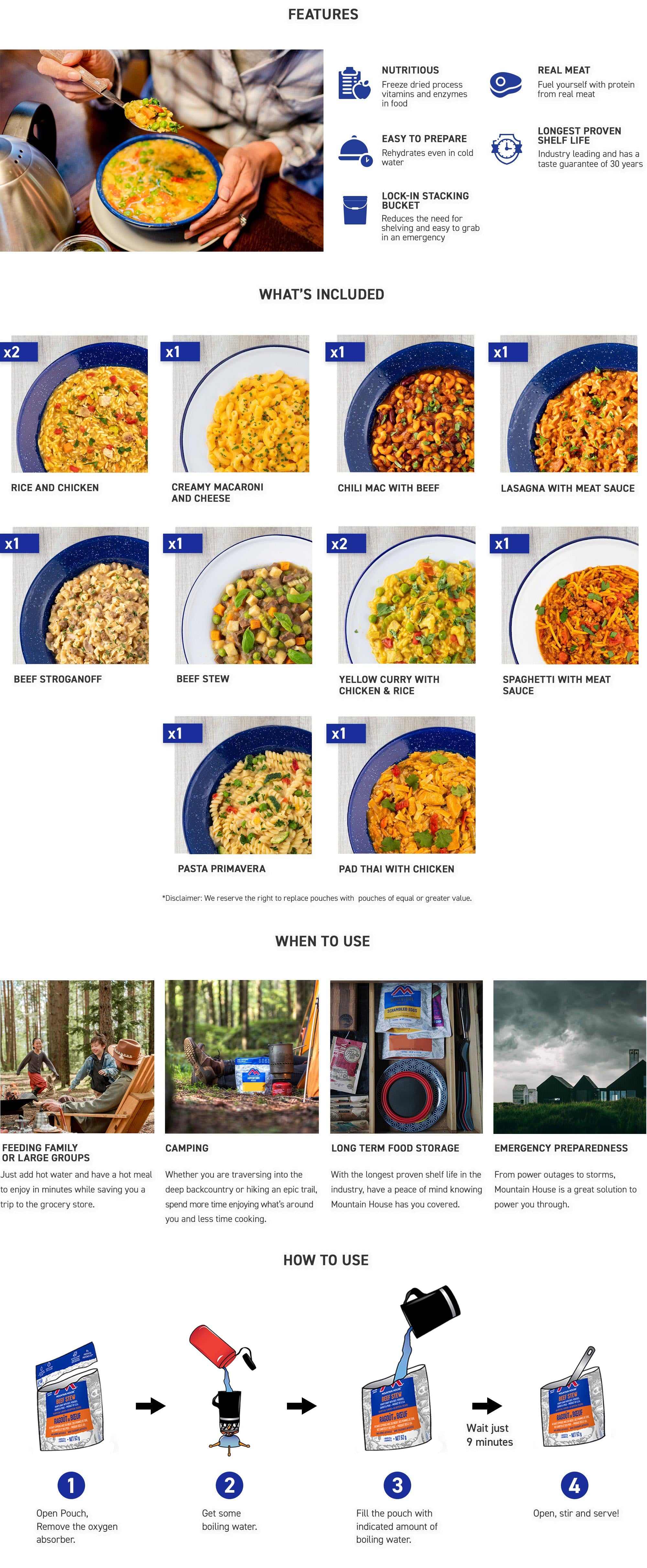 For nearly 50 years, consumers have continued to choose Mountain House as their favorite brand of freeze dried food for on-the-go adventures, emergency preparedness and survival. With just-add-water convenience, easy no-mess cleanup and home-cooked flavors, Mountain House is the best freeze dried camping, backpacking, hiking and emergency preparedness food money can buy!