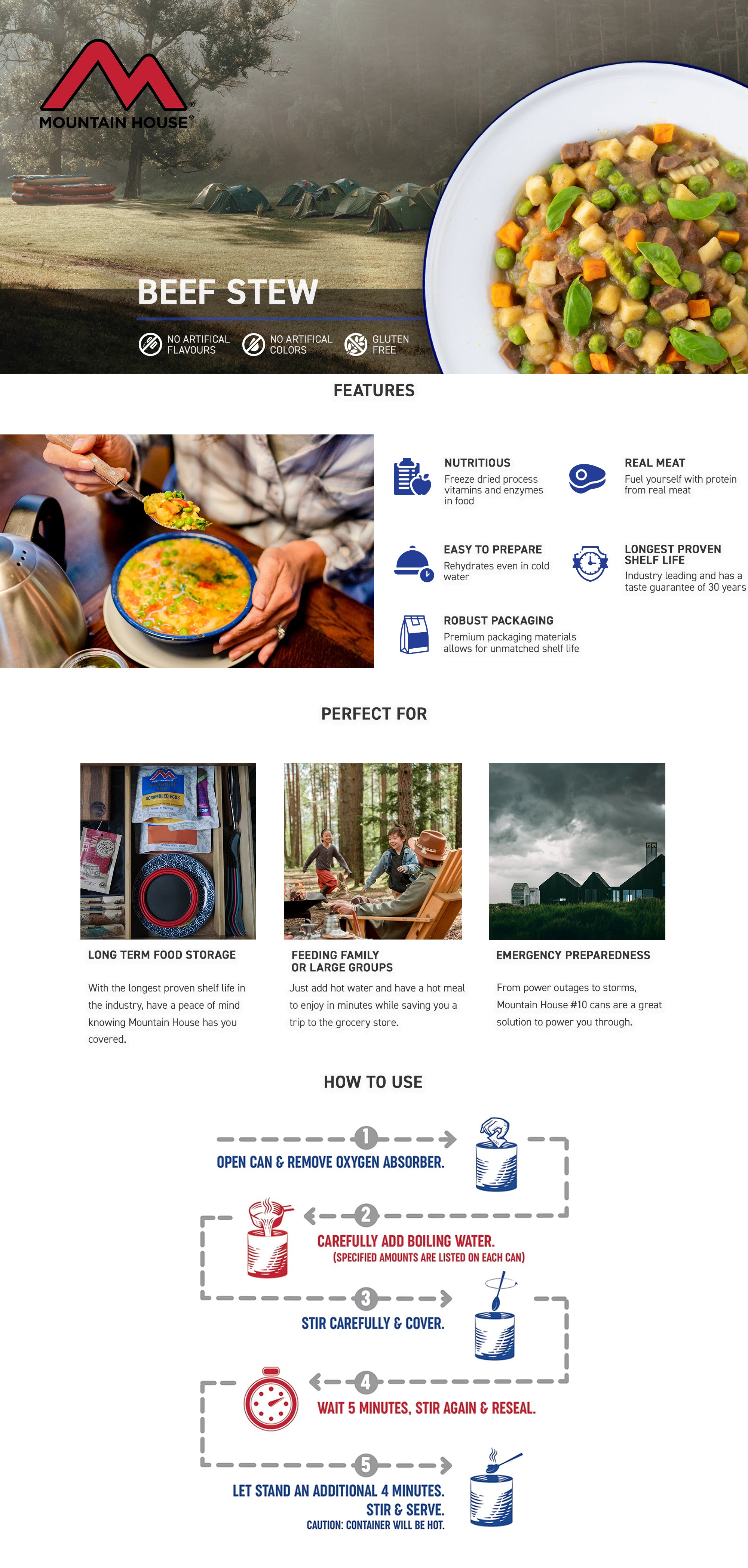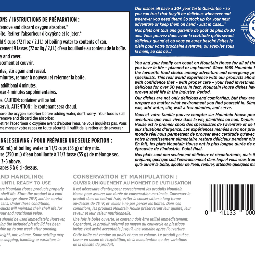 For nearly 50 years, consumers have continued to choose Mountain House as their favourite brand of freeze dried food for on-the-go adventures, emergency preparedness and survival. With just-add-water convenience, easy no-mess cleanup and home-cooked flavours, Mountain House is the best freeze dried camping, backpacking, hiking and emergency preparedness food money can buy!
