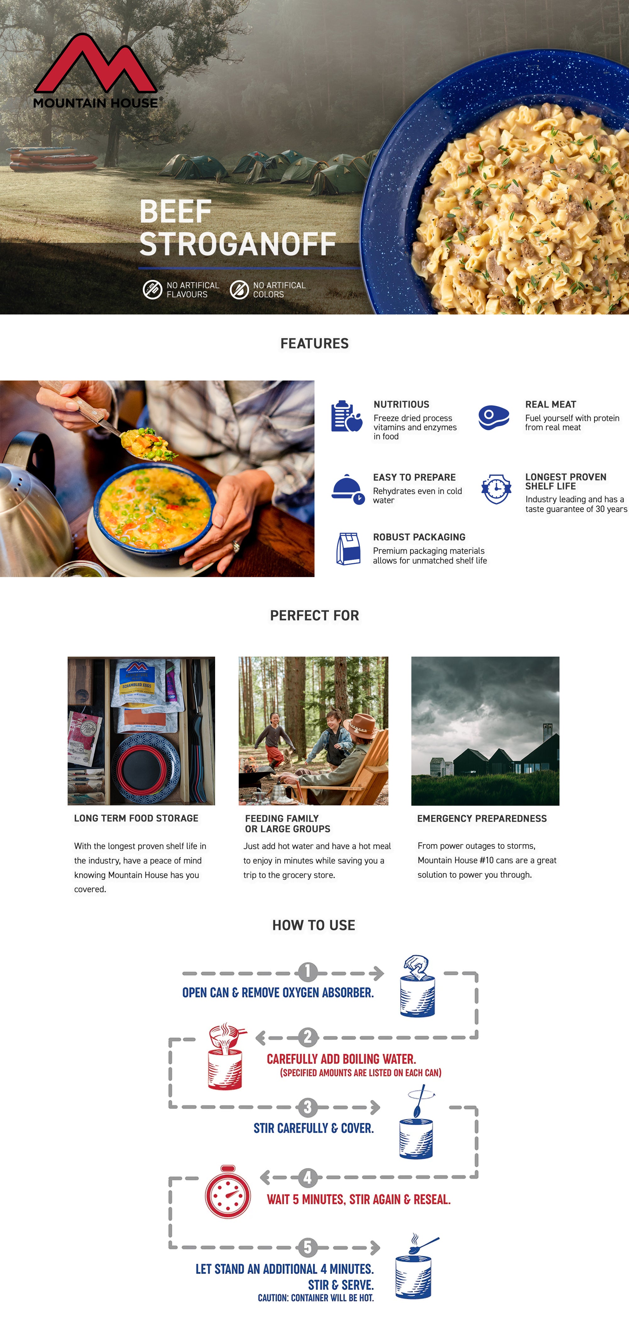 For nearly 50 years, consumers have continued to choose Mountain House as their favourite brand of freeze dried food for on-the-go adventures, emergency preparedness and survival. With just-add-water convenience, easy no-mess cleanup and home-cooked flavours, Mountain House is the best freeze dried camping, backpacking, hiking and emergency preparedness food money can buy!