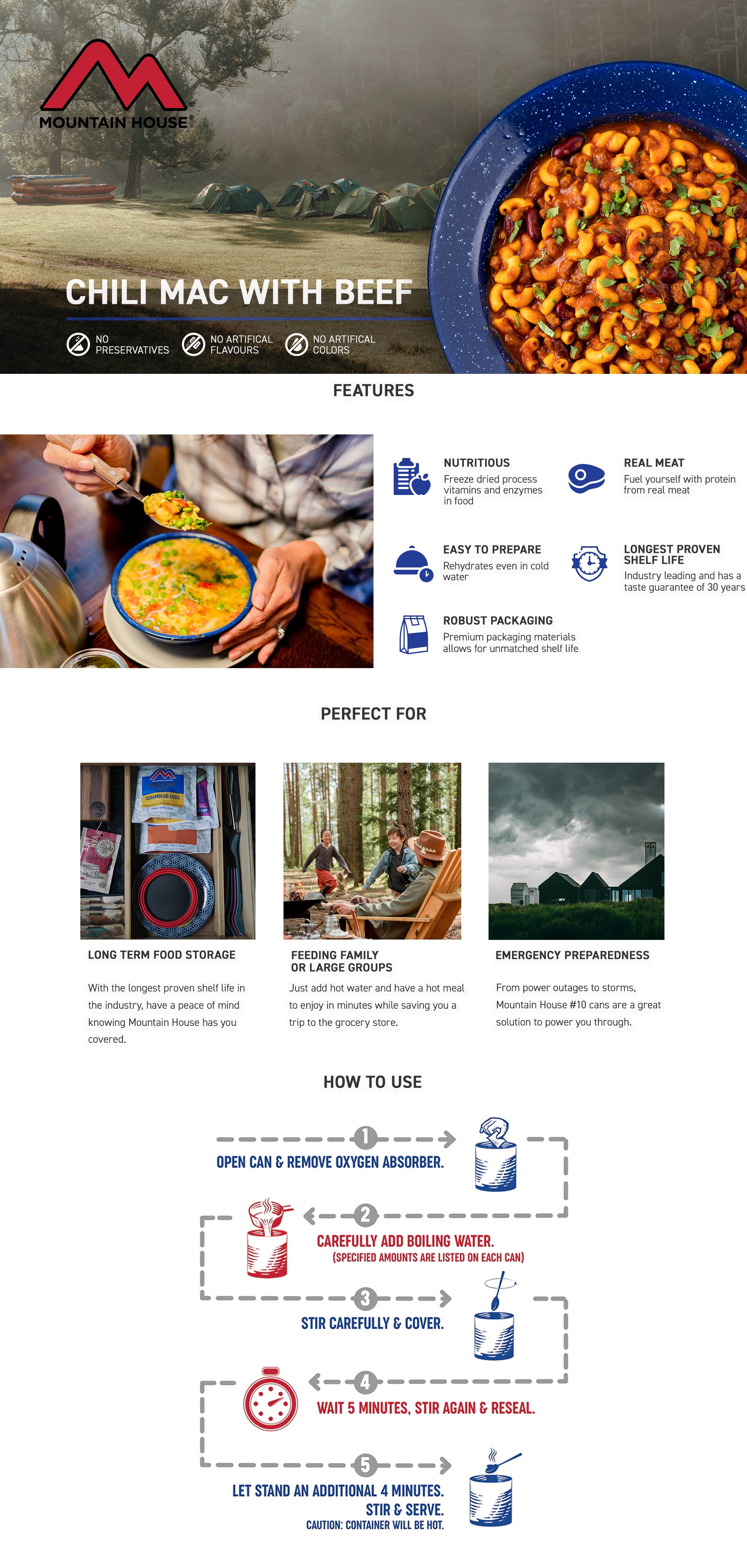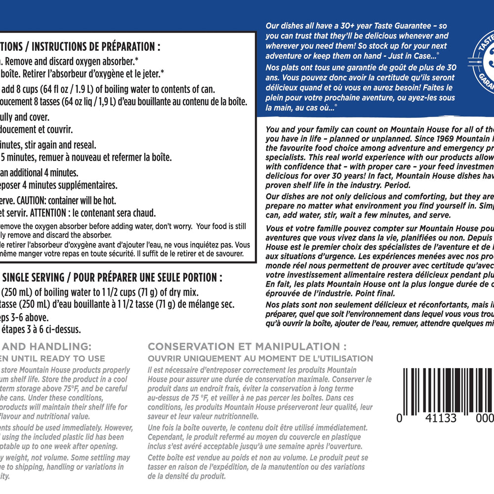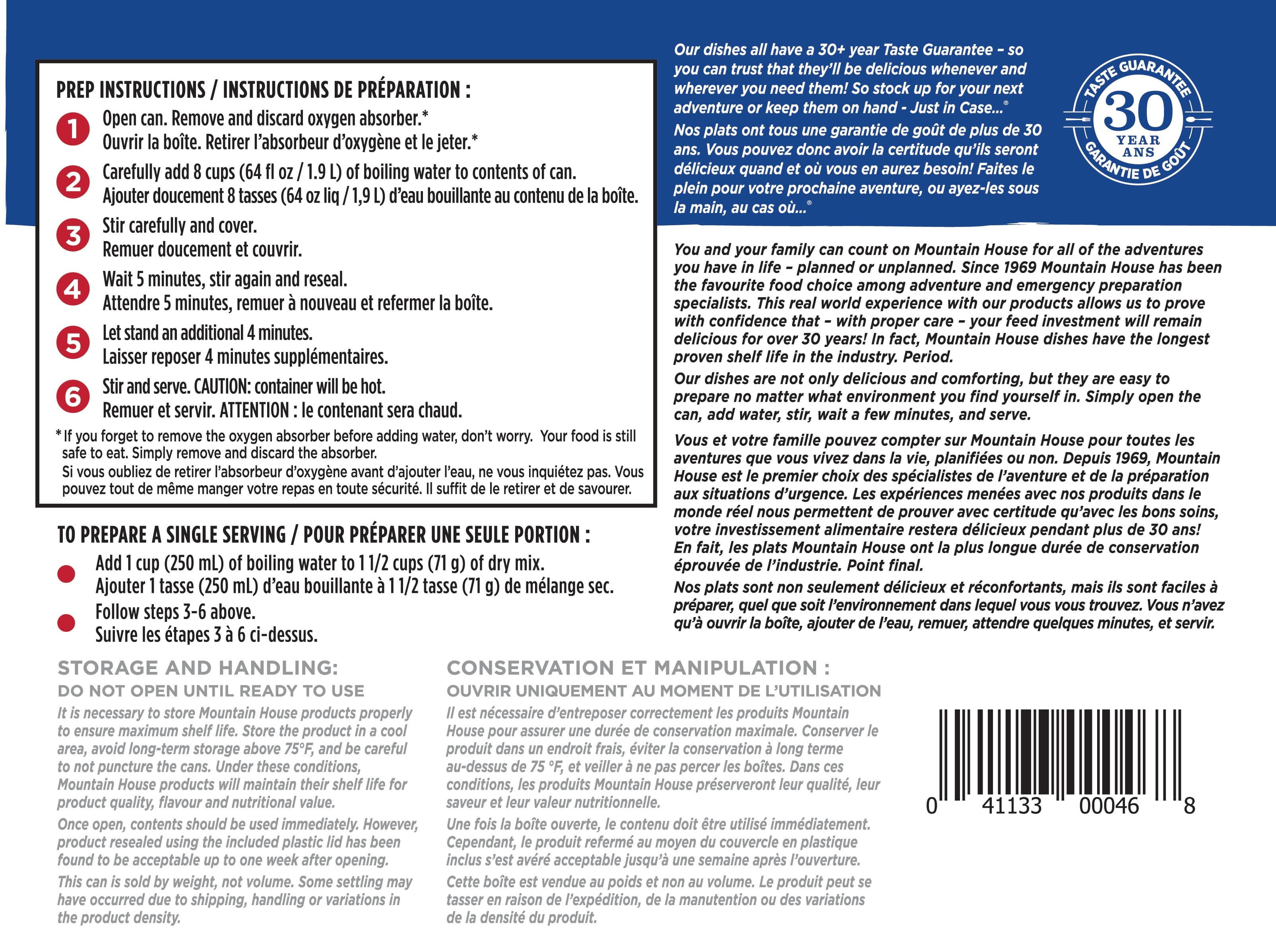 For nearly 50 years, consumers have continued to choose Mountain House as their favourite brand of freeze dried food for on-the-go adventures, emergency preparedness and survival. With just-add-water convenience, easy no-mess cleanup and home-cooked flavours, Mountain House is the best freeze dried camping, backpacking, hiking and emergency preparedness food money can buy!