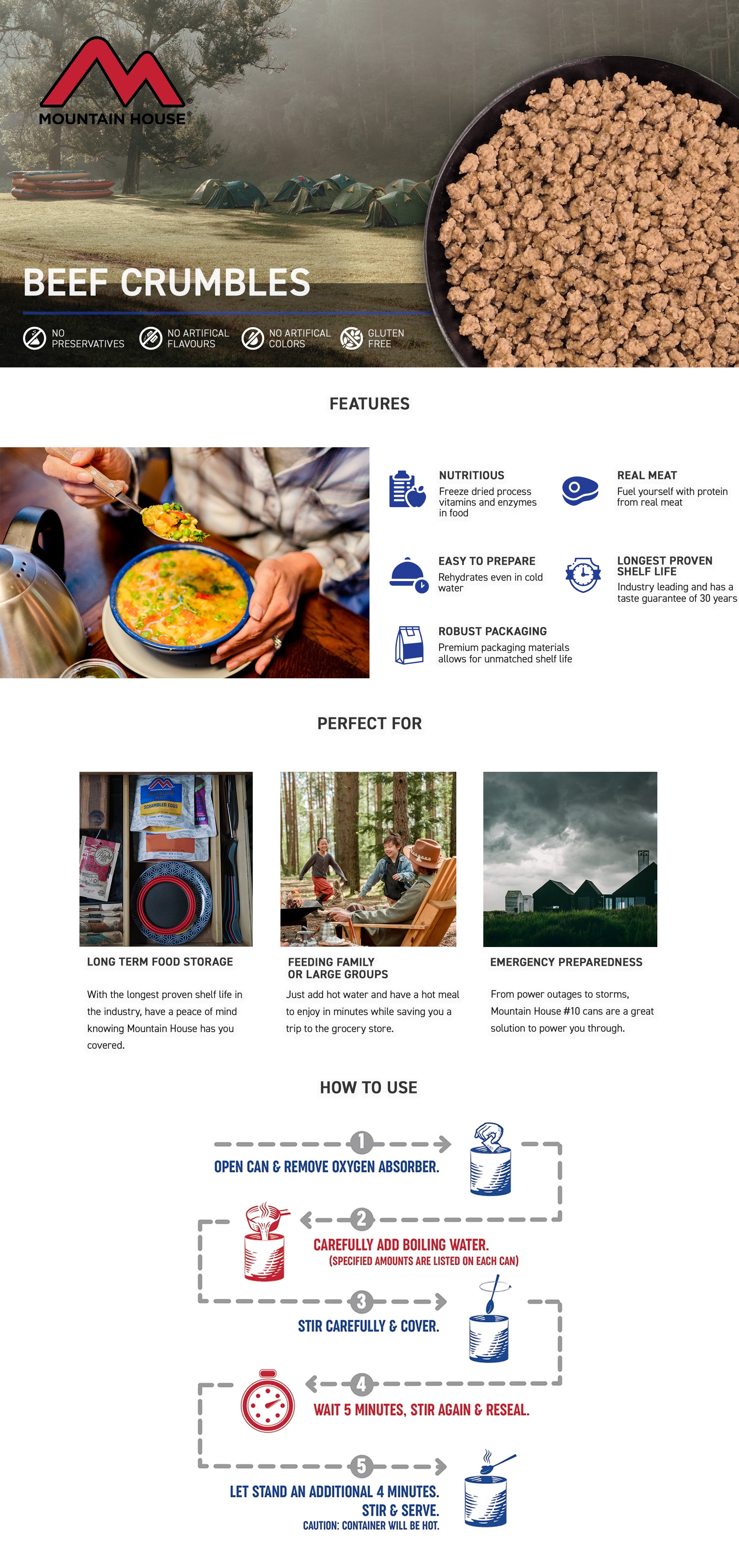 Enjoy the versatility and convenience of Mountain House Ground Beef in a #10 Can, an essential ingredient for creating hearty and nutritious meals with ease. Designed for the demands of emergency food storage, outdoor adventures, or simply convenient home cooking, Mountain House #10 cans are celebrated for their exceptional shelf life.
