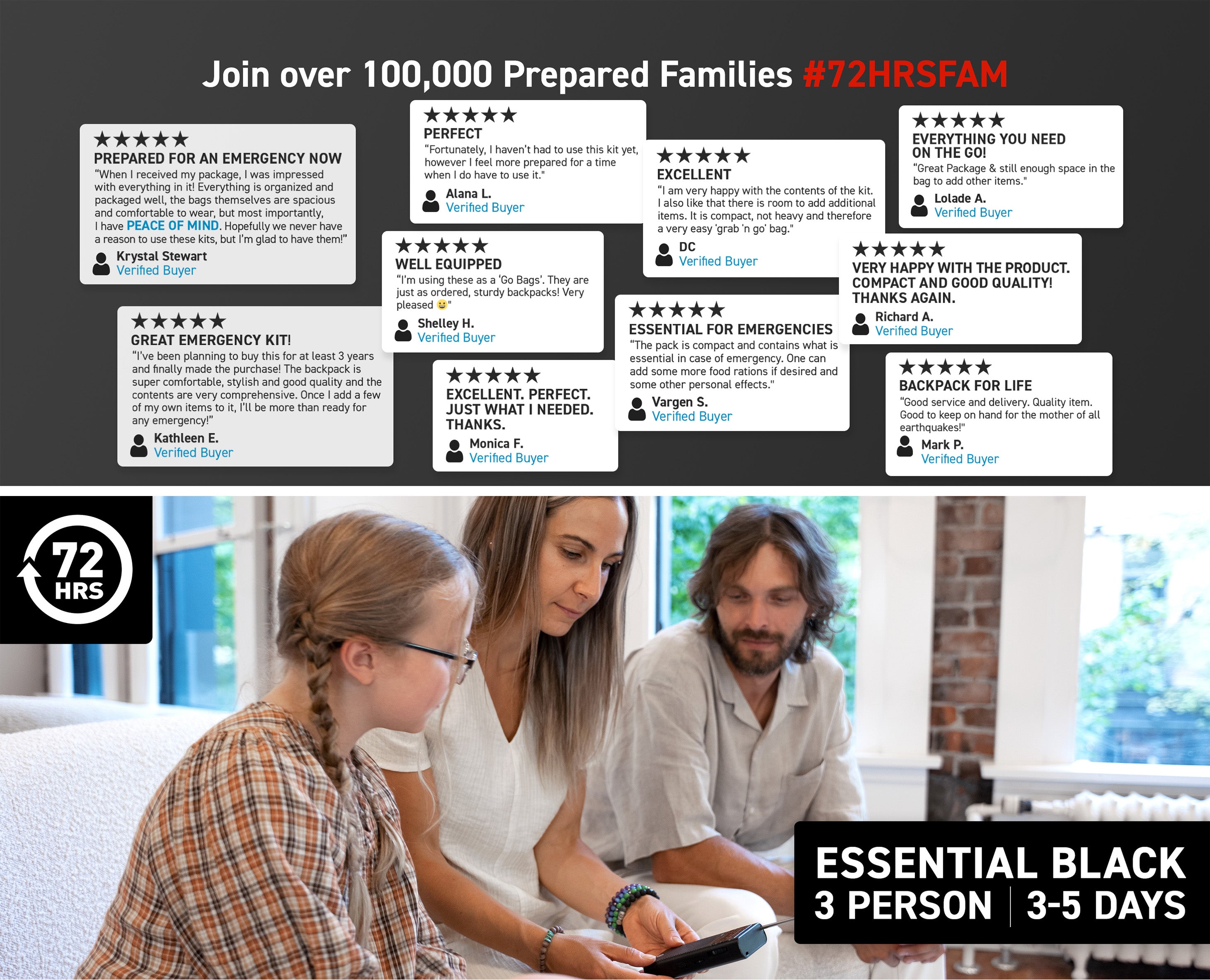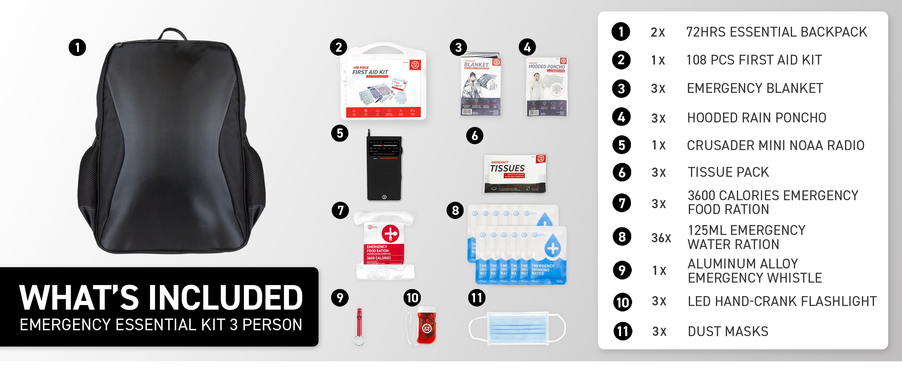 3 Person 72HRS Essential Backpack - Emergency Survival Kit (Black)