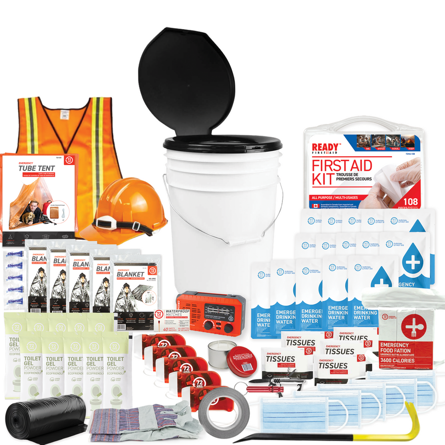 The kit is organized in a 5-gallon food-grade plastic bucket with a handle and is packaged in a red essential backpack, which is water-resistant.