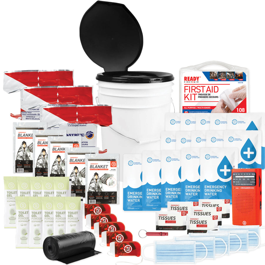 5 Person Essential Kit for families, workplaces, or organizations. Contains essential emergency supplies such as food, water, light, blankets, and more.