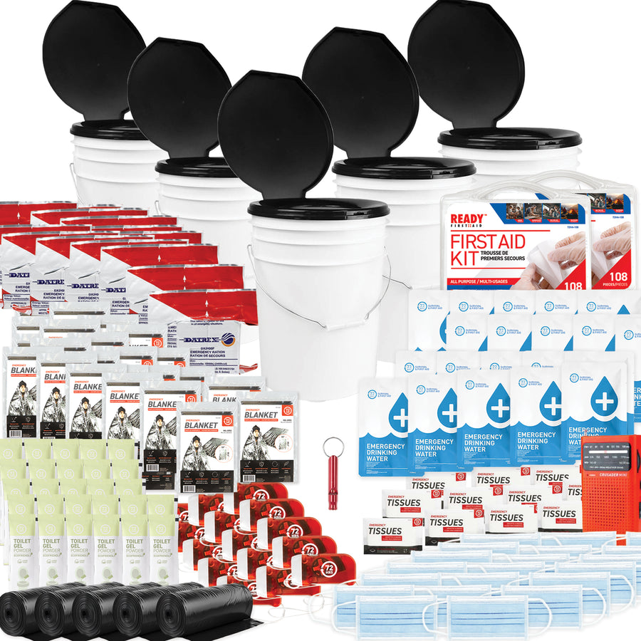 70 Person Essential Kit for workplaces or organizations. Contains essential emergency supplies such as food, water, light, blankets, first aid kits, and more.
