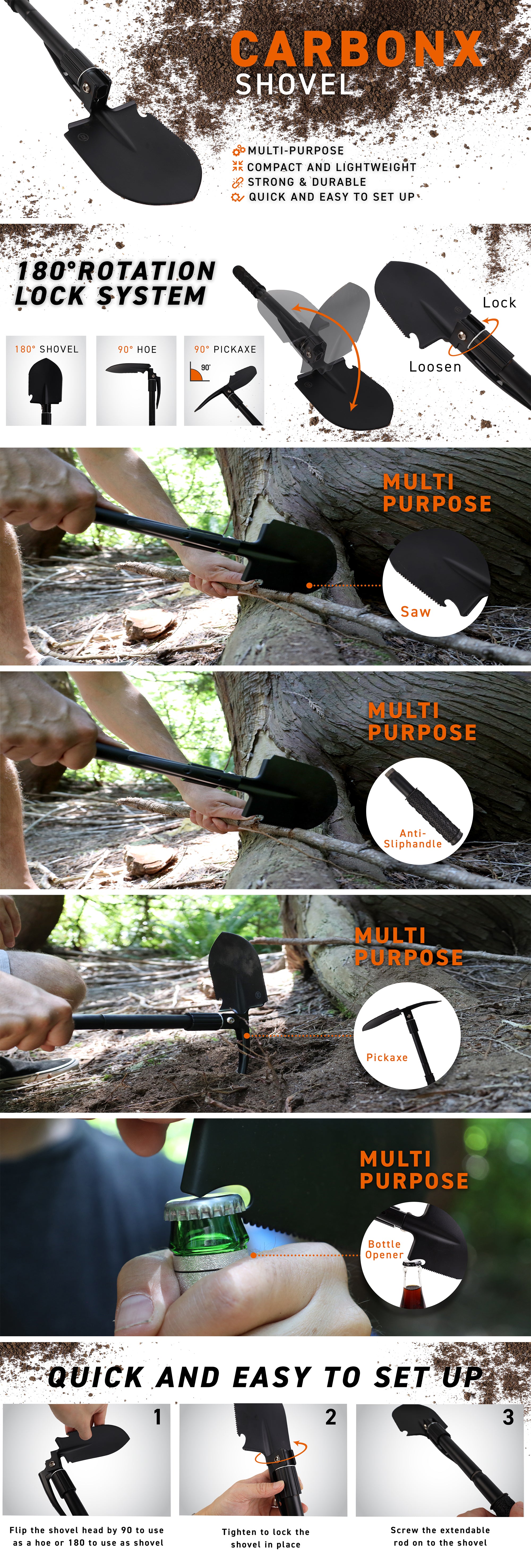The 72HRS Carbon X Shovel also features a spade/saw edge, perfect for cutting through the woods when you need to make a fire or shelter. The pick axe allows you to break apart rocks, clear out soil, and dig deep holes for those necessary tasks. The nail puller on the shovel can be useful when removing nails, and the bottle opener is perfect for cracking open a cold one after a long day of work. With the 72HRS Carbon X Shovel, you can handle any situation with ease. Its multi-functional design ensures you have the perfect tool for any situation. Be it camping, hiking, or survival, this shovel has got you covered.
