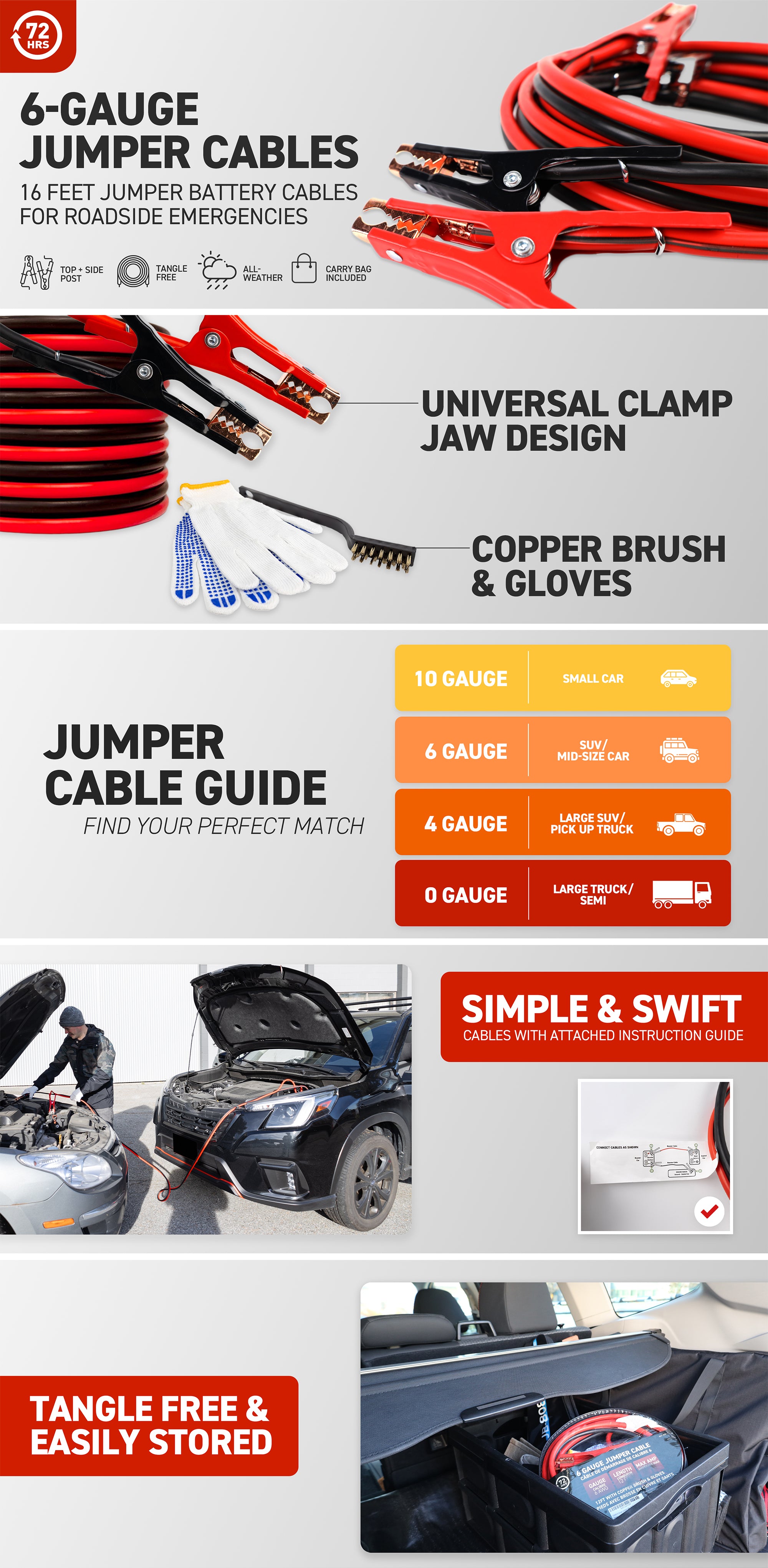 72HRS 6 Gauge Battery Jumper Cable, 16 Ft
