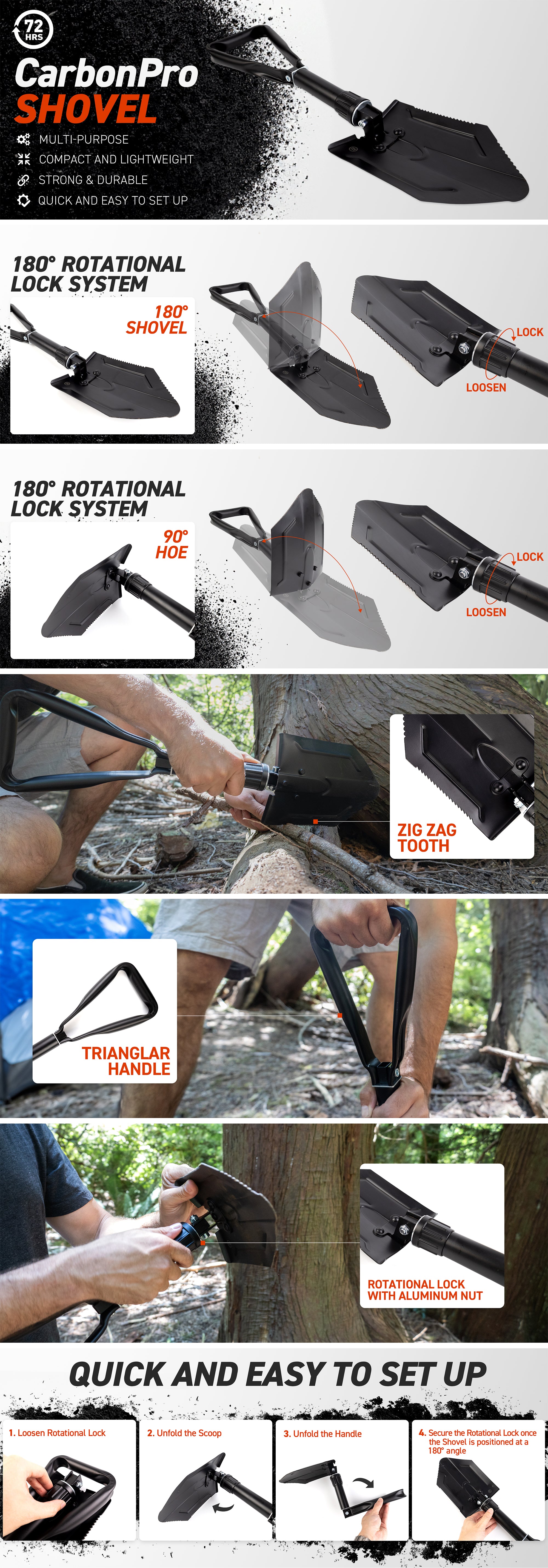 The 72HRS CarbonPro Shovel is the ultimate tool for any outdoor enthusiast. It's built to withstand the toughest conditions and made with high-quality carbon steel, which makes it durable and long-lasting. The sawtooth edge on the shovel allows you to cut through tough debris with ease, and when you rotate the blade 90 degrees, it can be used as a hoe or pick for digging. This shovel is perfect for any camping or hiking trip, as it is lightweight and compact enough to fit in your backpack or attach to your gear. The CarbonPro Shovel is also designed with an ergonomic handle for a comfortable grip, allowing you to use it for extended periods of time without fatigue.