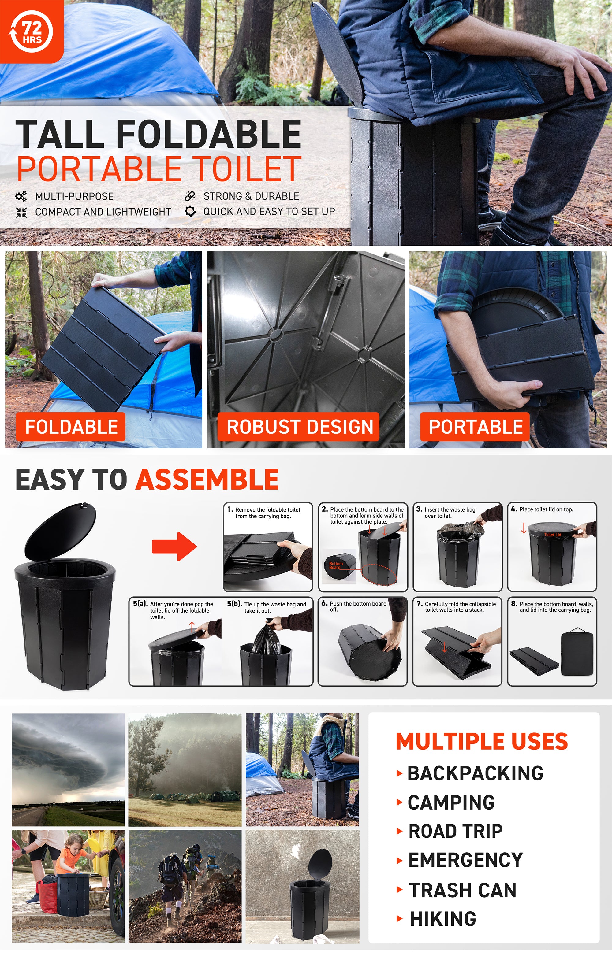 72HRS Collapsible Portable Toilet With Bucket (Including 12 Toilet Bags) (OPEN BOX)