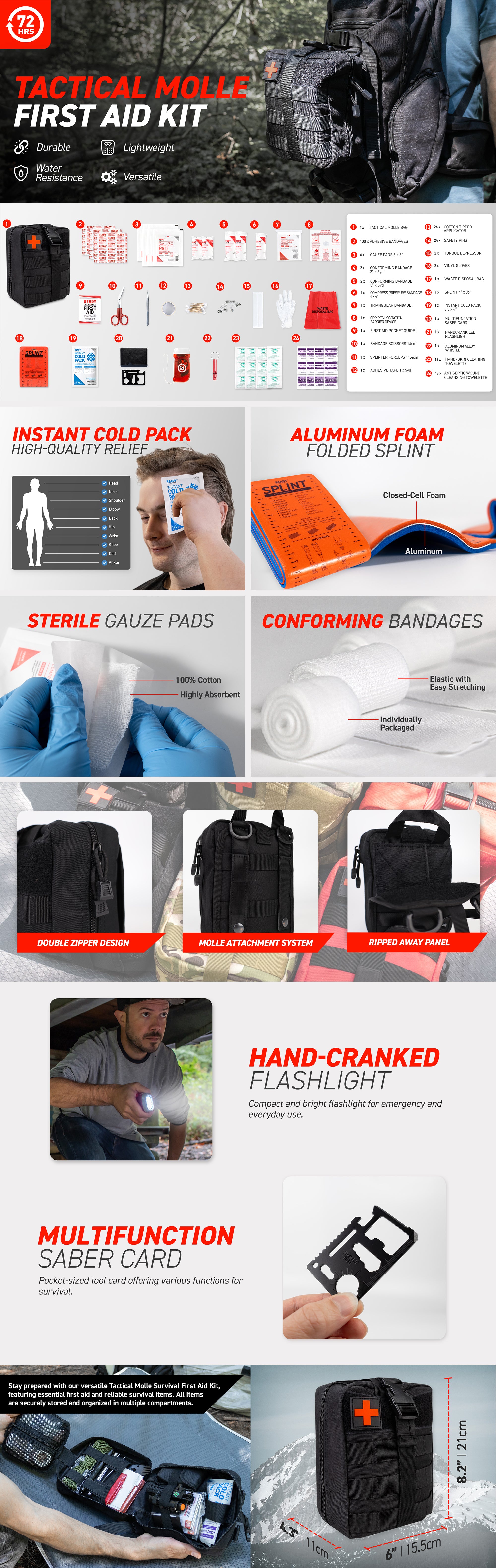 - Durable, Organized Storage: The MOLLE tactical bag features multiple compartments, ensuring supplies are neat and readily accessible.