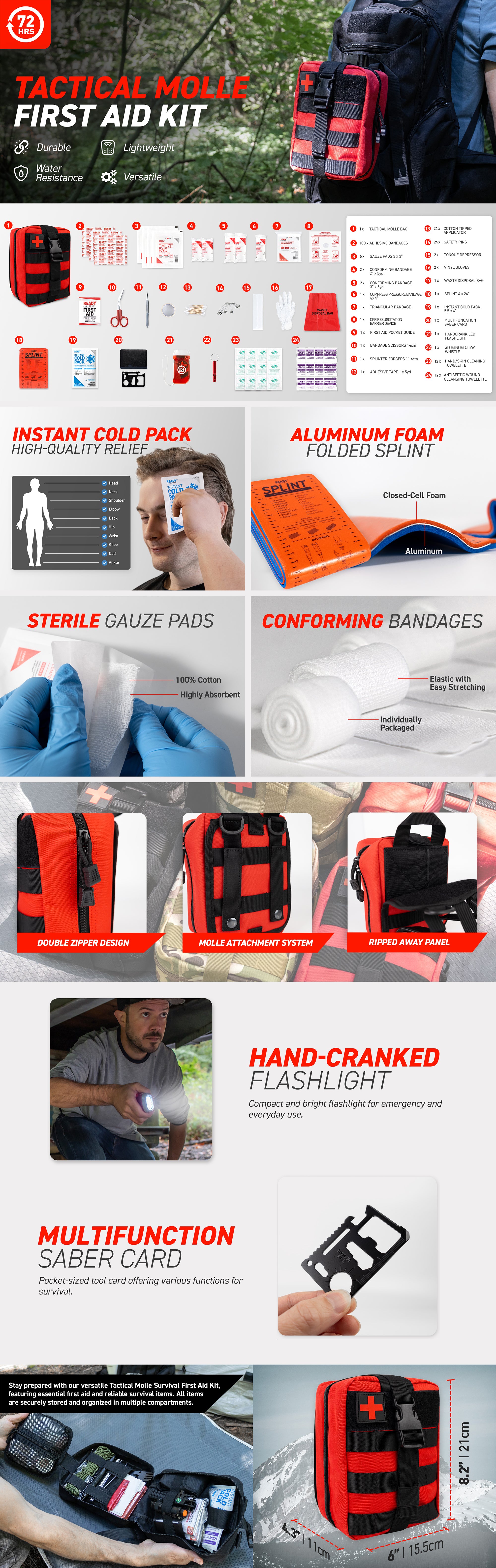 - Durable, Organized Storage: The MOLLE tactical bag features multiple compartments, ensuring supplies are neat and readily accessible.