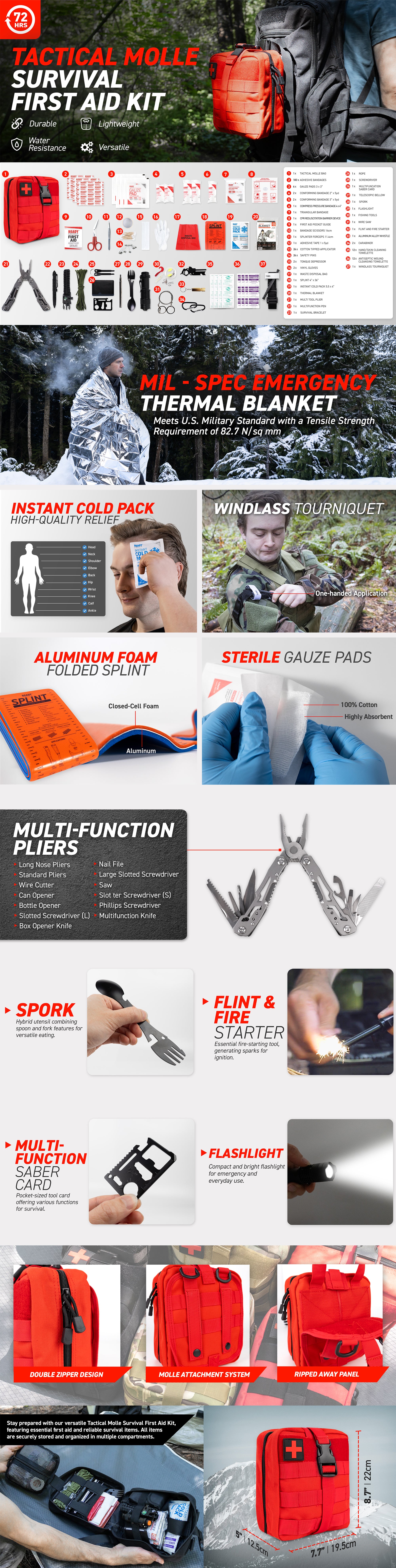 • Durable, Organized Storage: Features a large MOLLE tactical bag with multiple compartments for easy organization and access to all supplies.