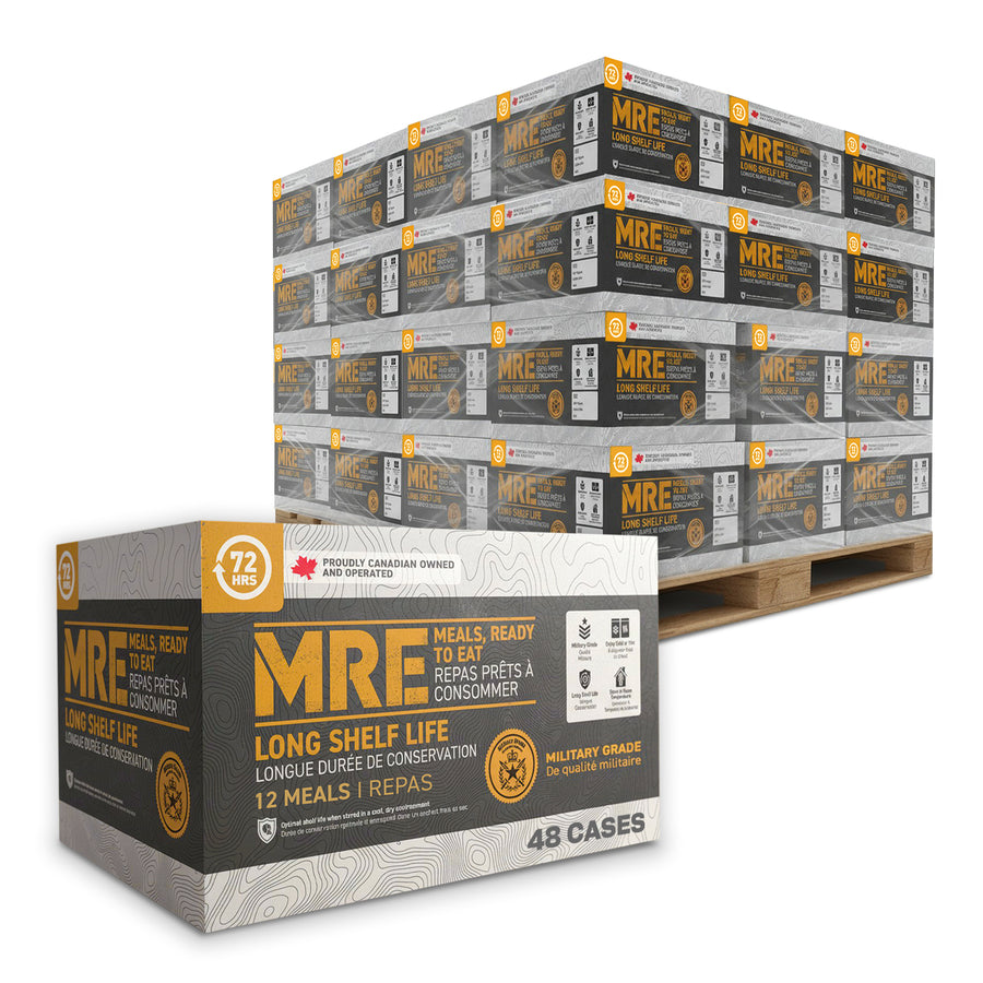 Plan ahead with bulk survival food. Each pallet contains 48 cases of 72HRS MRE Meals, designed for emergency preparedness, disaster relief, institutional supply, and large-scale outdoor programs. Our durable military-style rations deliver dependable nutrition with balanced calories and protein.