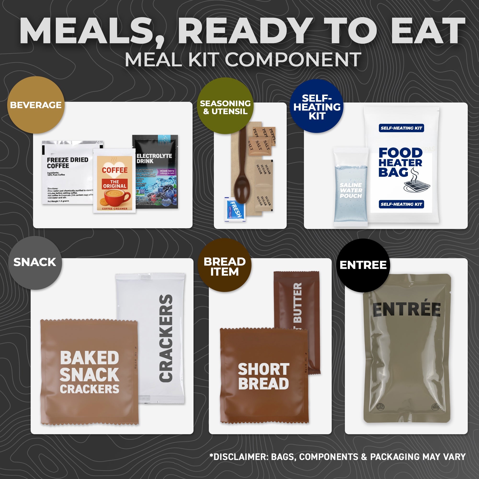 - ✔ Self-Heating Kit Included : heat meals in about 10–12 minutes using the heater bag and saline water pouch.