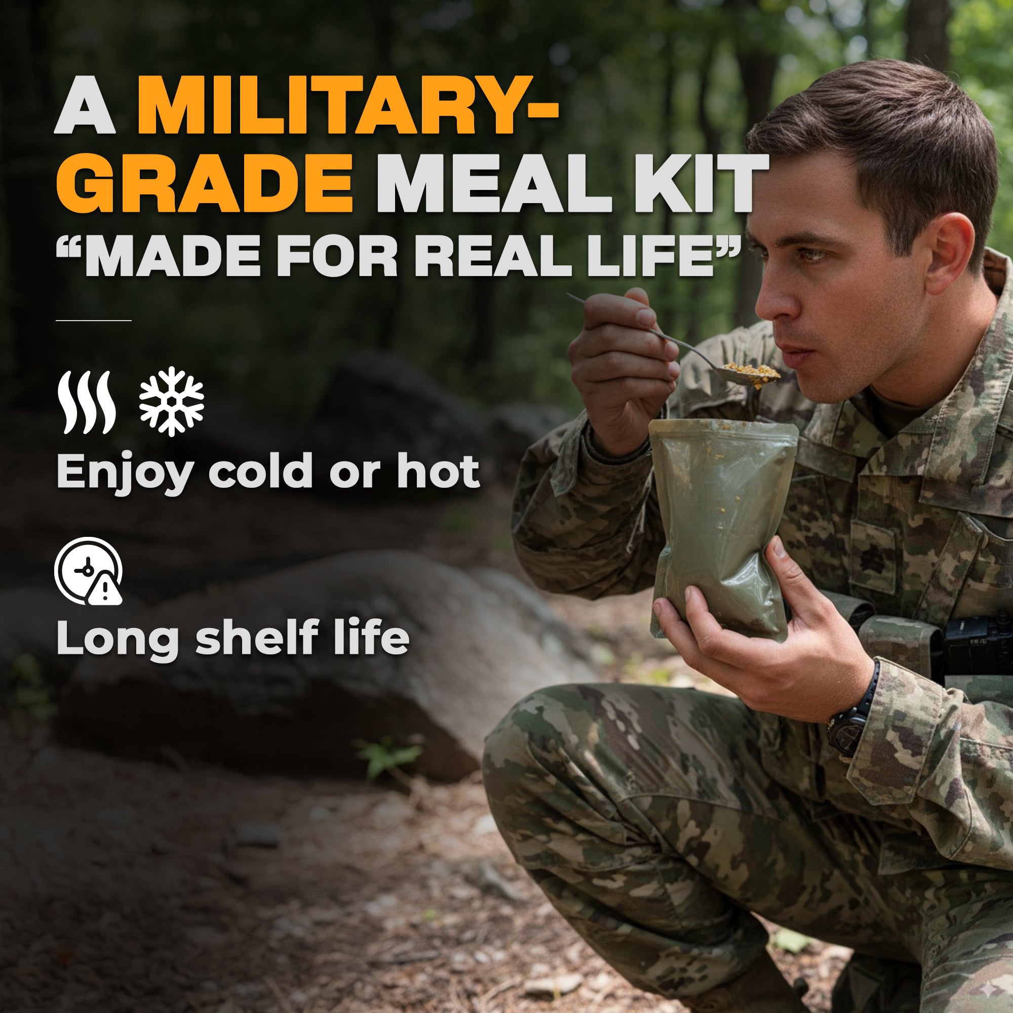 72HRS MRE Meals are durable, shelf-stable, fully cooked meals that can be eaten hot or cold. Each meal includes a flameless self-heating kit, allowing you to heat your food using the included saline water pouch — no stove, fire, or electricity required.