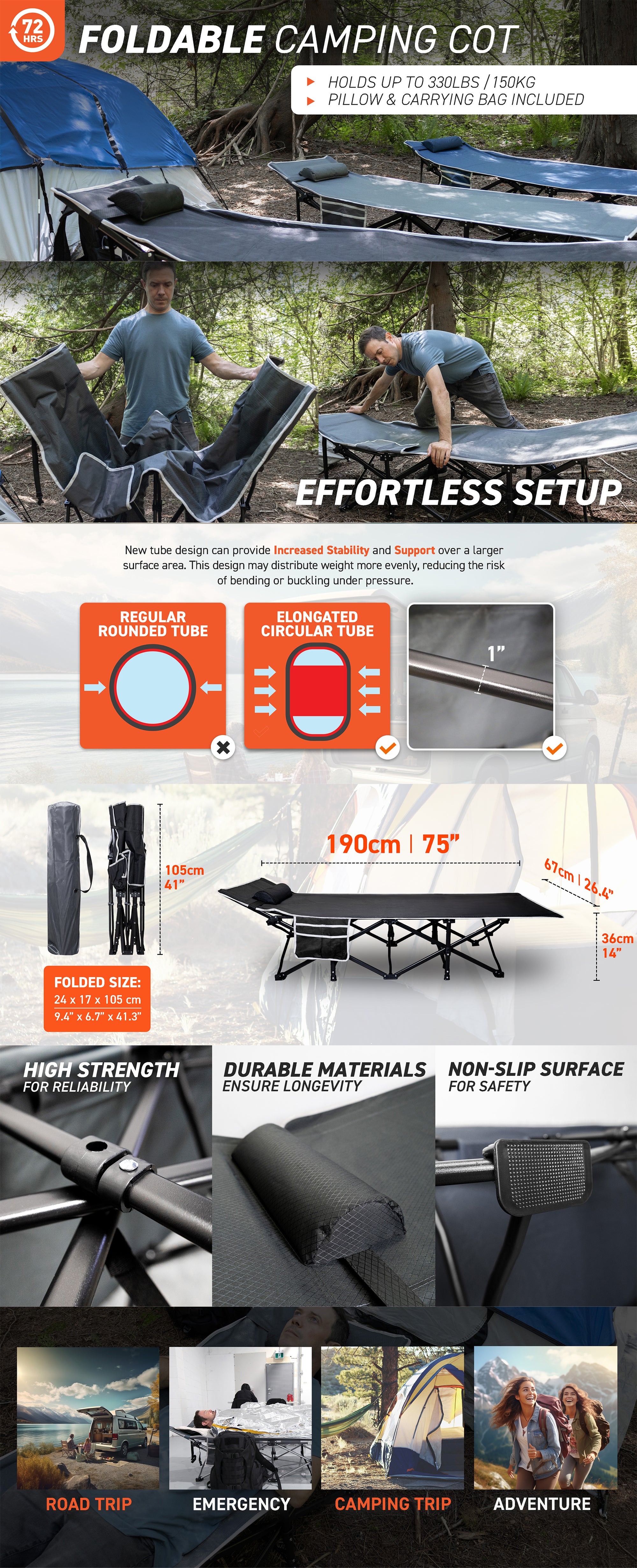 72HRS Portable Camping Cot, with Detachable Headrest and Carry Bag (Black)