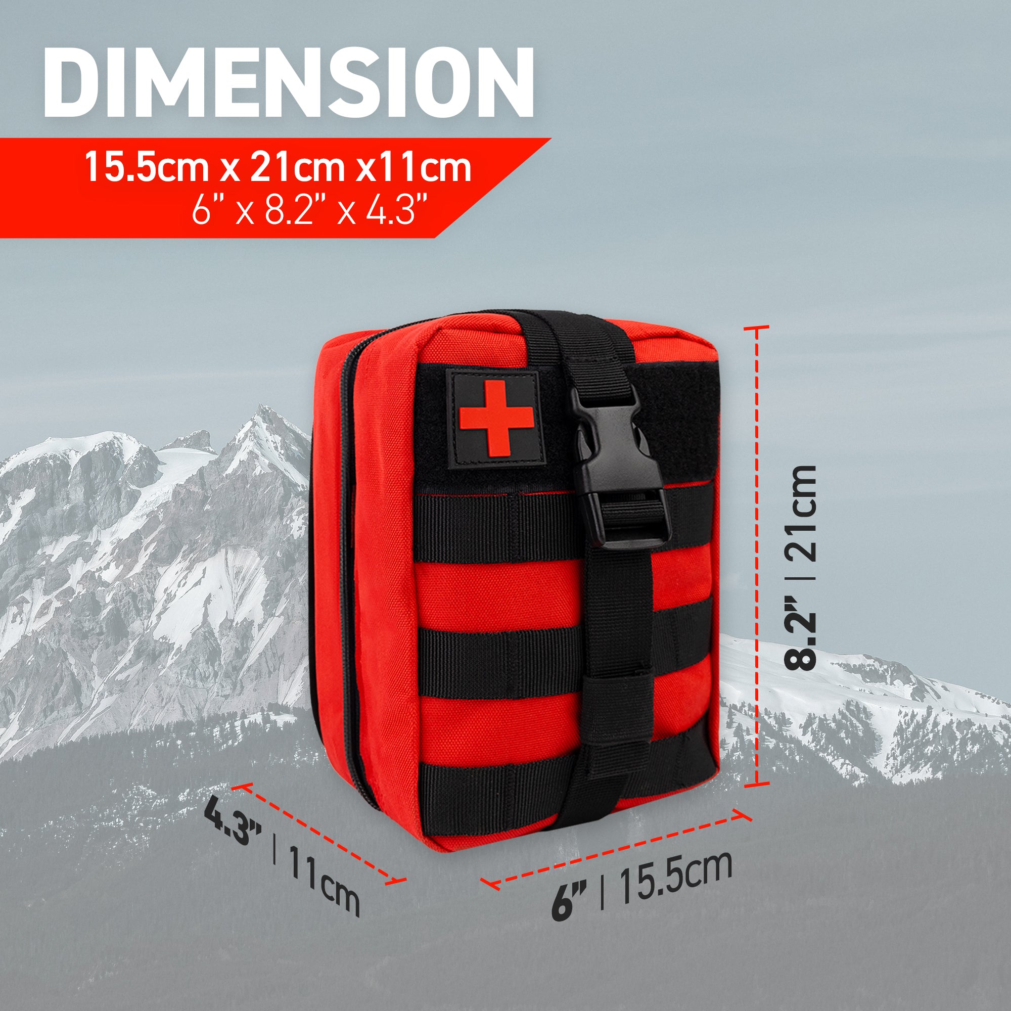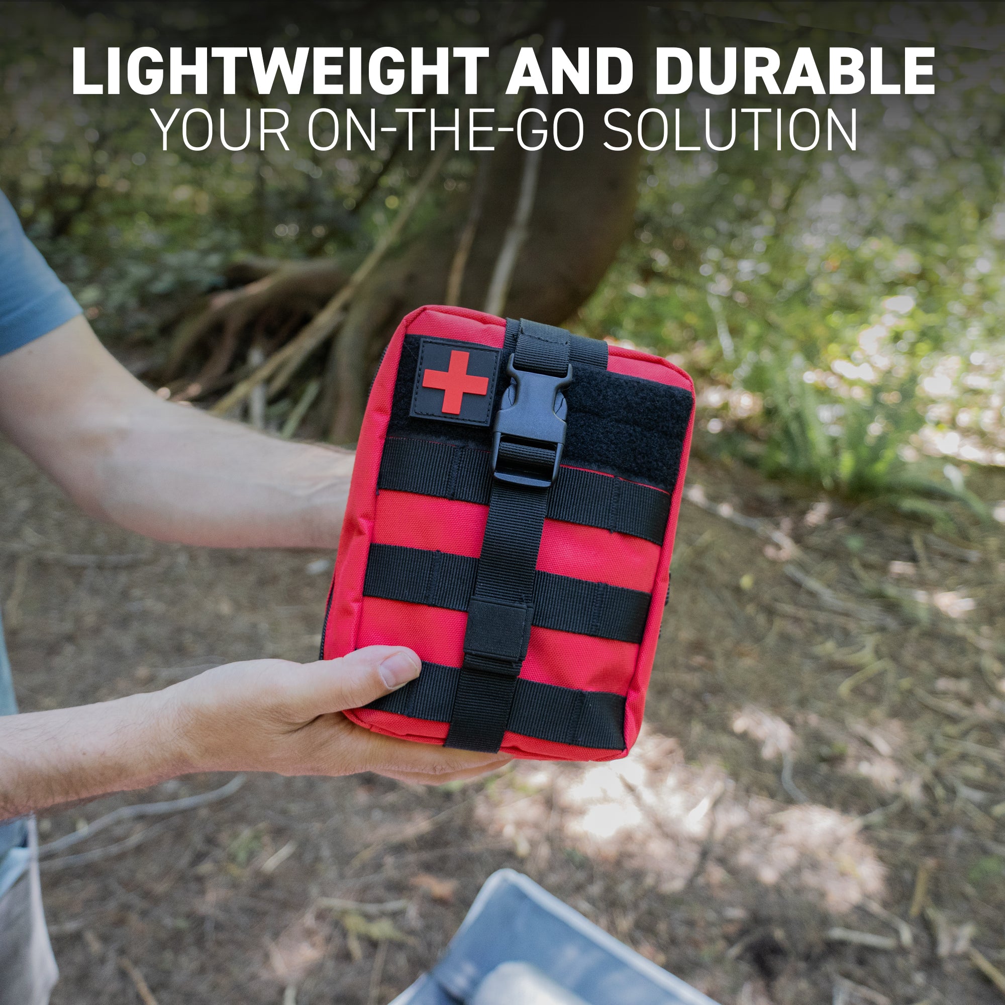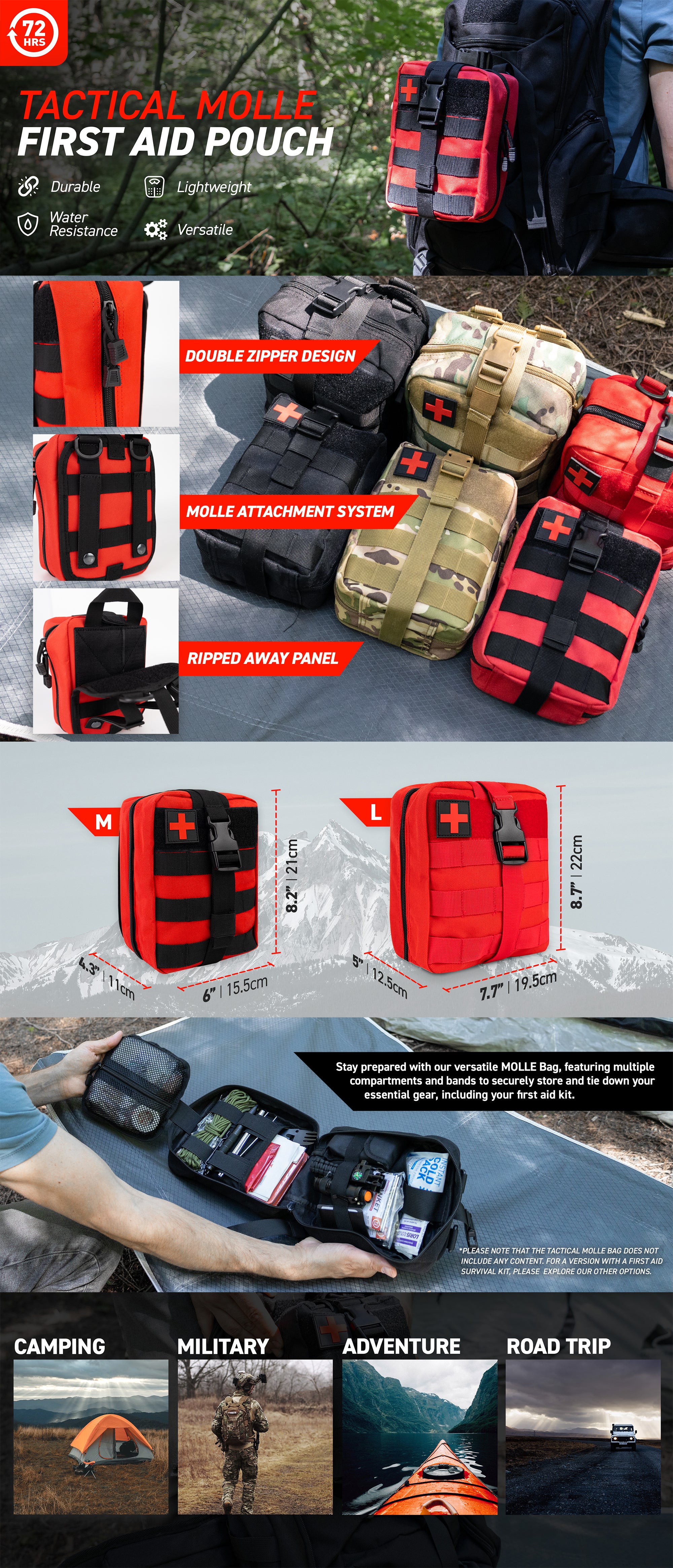 Please note: The Tactical MOLLE Bag does not include any content. For a version with a first aid survival kit, please explore our other options.