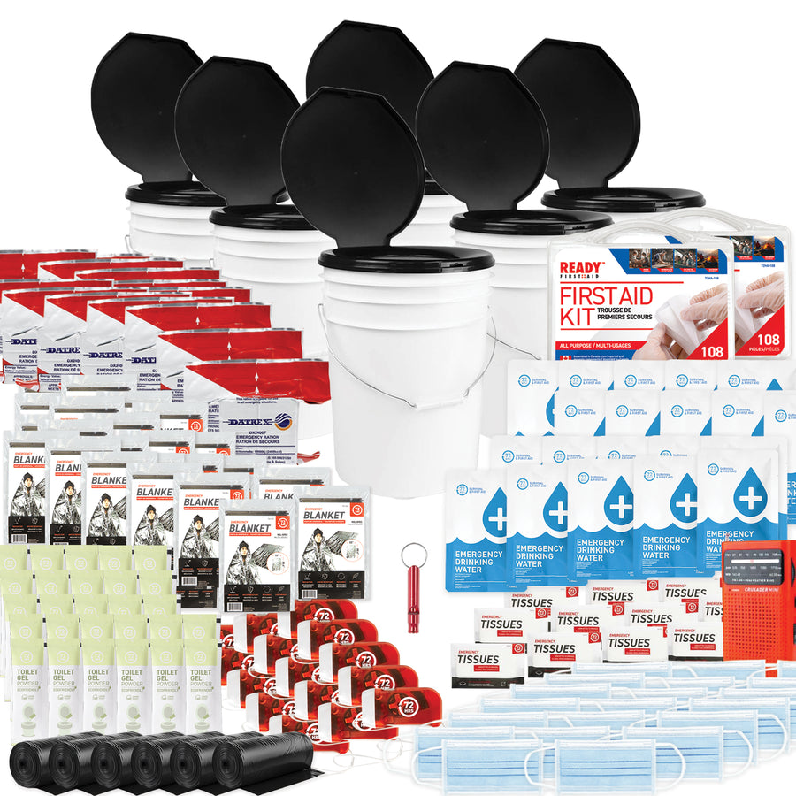 80 Person Essential Kit for workplaces or organizations. Contains essential emergency supplies such as food, water, light, blankets, first aid kits, and more.