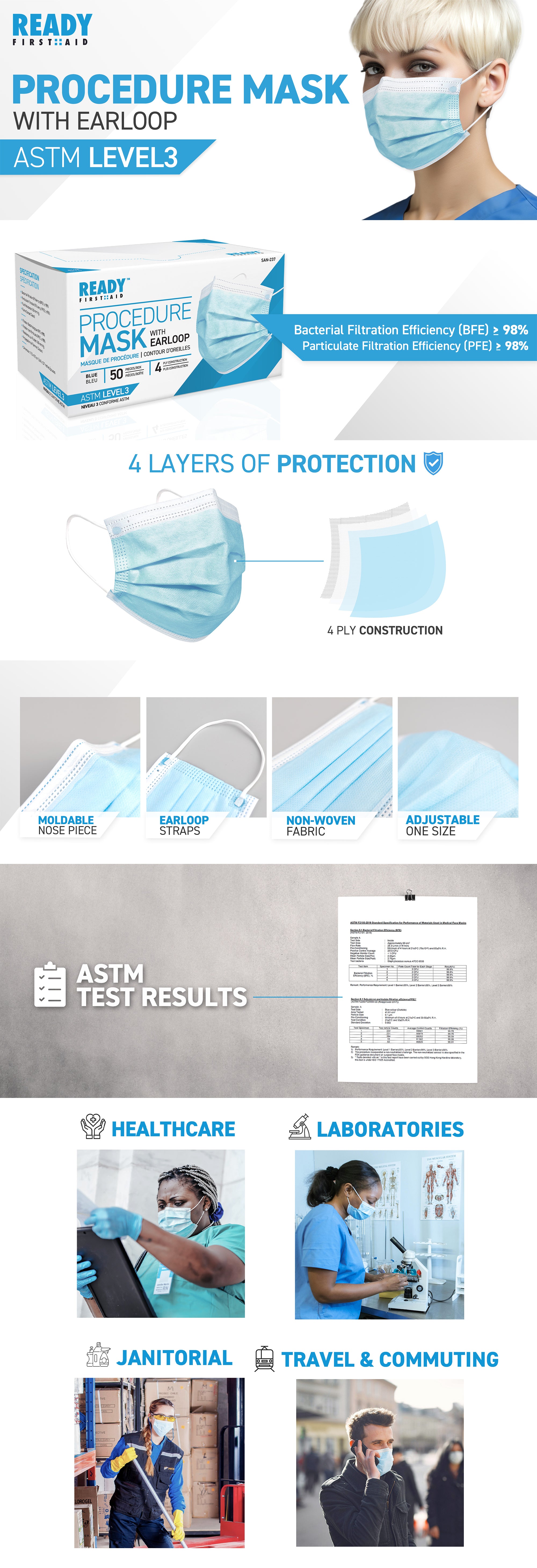 Use the Ready First Aid ASTM L3 PROCEDURE MASK in environments where high-level filtration is necessary, such as healthcare settings, public transportation, and areas with high dust and pollutant exposure. For optimal protection, place the mask over your nose and mouth, adjust the nose piece to fit, and secure the earloops comfortably around your ears.