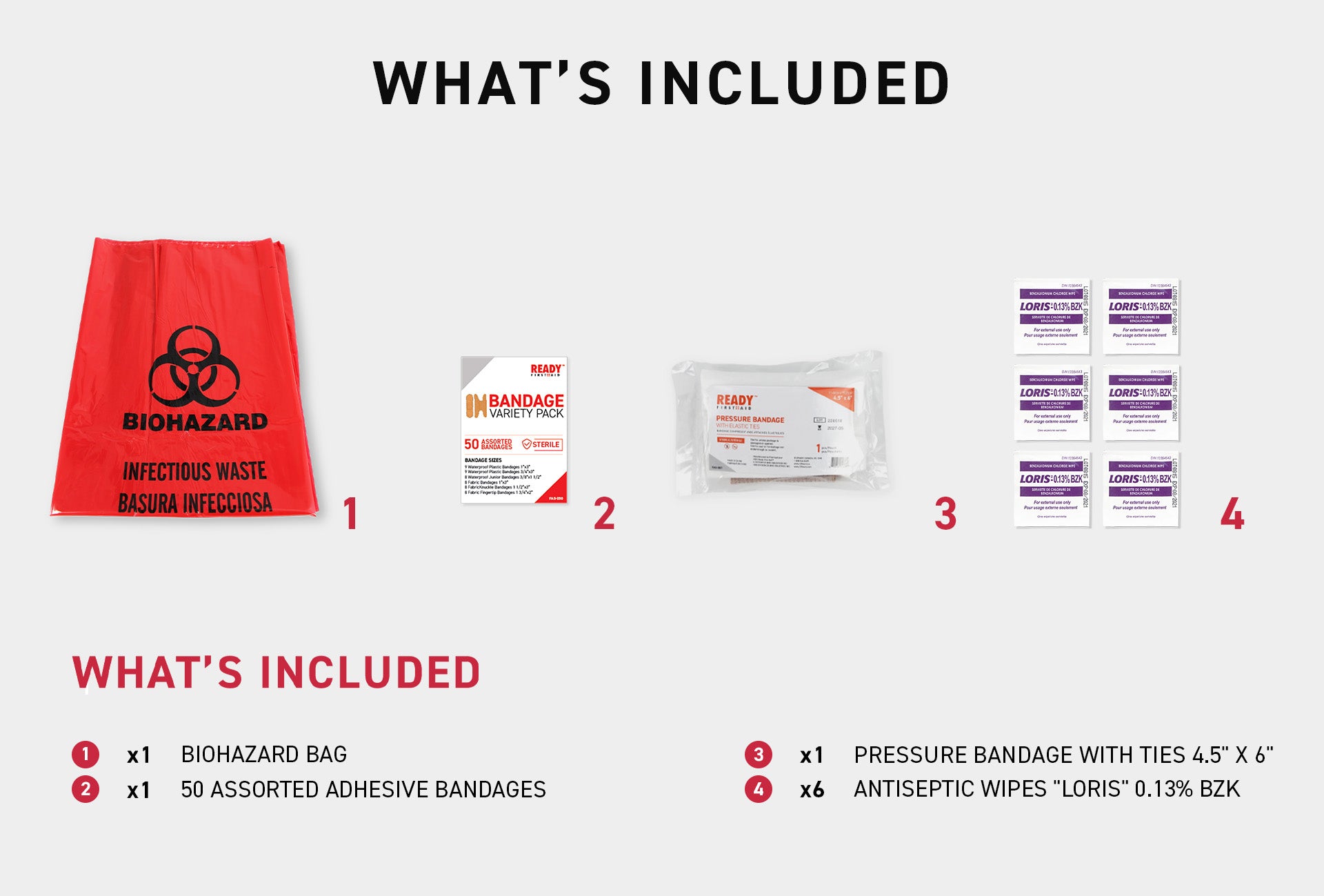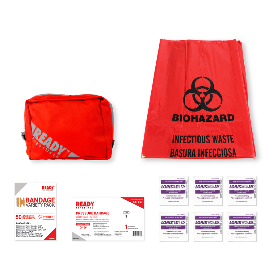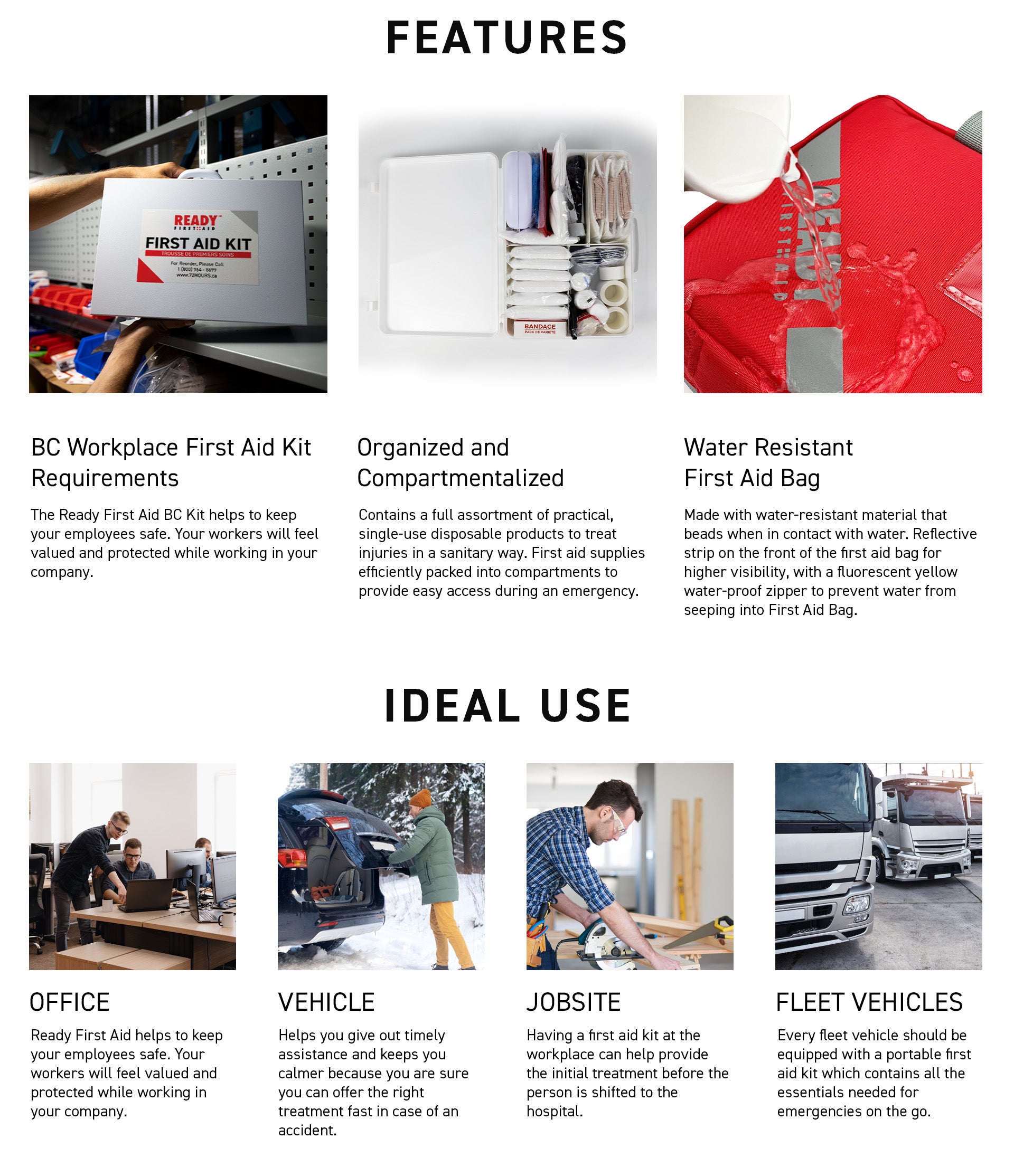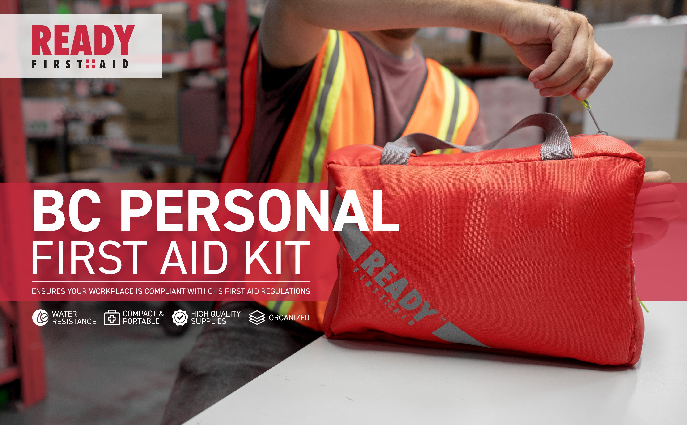 The Ready First Aid WorksSafeBC Personal First Aid Kit contains all the required components set forth by the British Columbia Occupational Health and Safety Regulation. Available in 2 storage options - water-resistant bag or plastic box. The kit is made of high-quality first aid equipment that will aid in treating common workplace injuries.