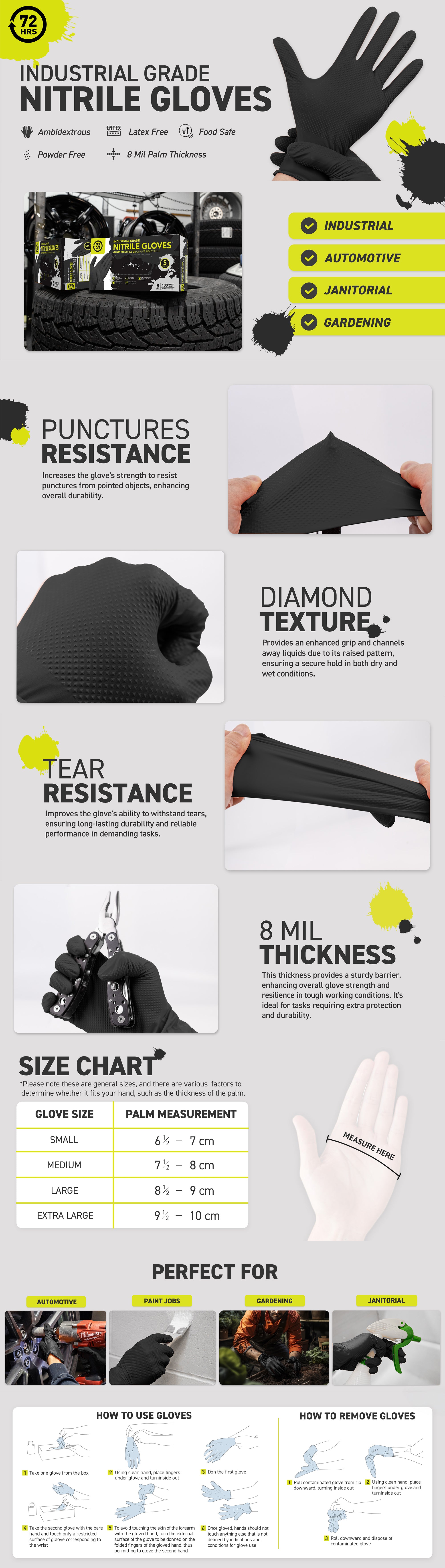 72HRS Industrial Grade Black Nitrile Gloves combine durability, comfort, and versatility for an all-in-one solution to your hand protection needs. Built with an 8 Mil thickness and a unique diamond texture, these gloves offer superior grip and puncture resistance. Designed for industrial and professional use, they’re also an excellent choice for various DIY tasks. Powder-free, latex-free construction reduces the risk of allergic reactions, while the ambidextrous fit and disposable design ensure convenience and hygiene.