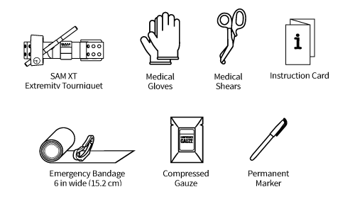 The kit contains: SAM XT Extremity Tourniquet, Medical Gloves, Medical Shears, Compressed Gauze, Permanent Marker, Emergency Bandage (6" wide), Instruction Card