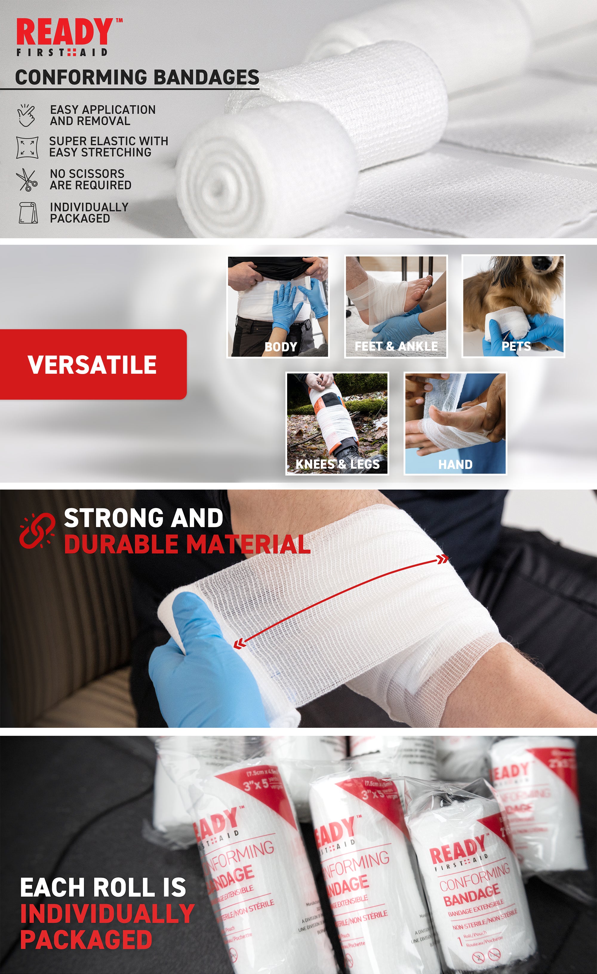 The Ready First Aid Conforming stretch bandages are great for binding dressings that stretch and mold to the natural body contours. It also provides light compression for support and stability. Made to be resilient when stretched and are fray resistant and durable