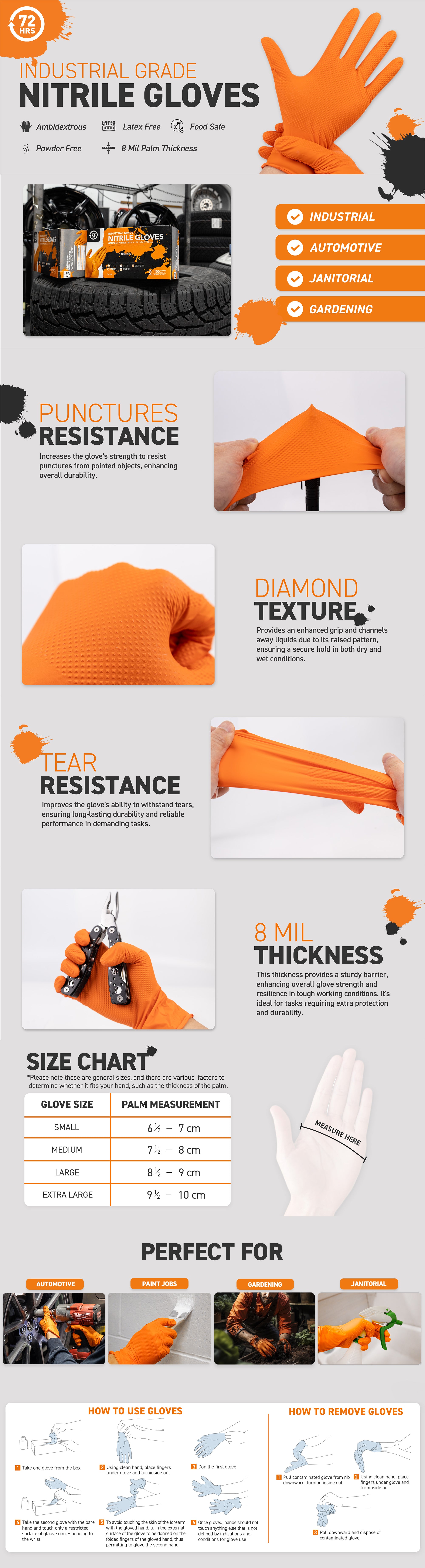 Industrial Grade Nitrile Gloves, Orange, Box of 100 Pieces, 8 Mil - 72HRS [DAMAGED BOX]