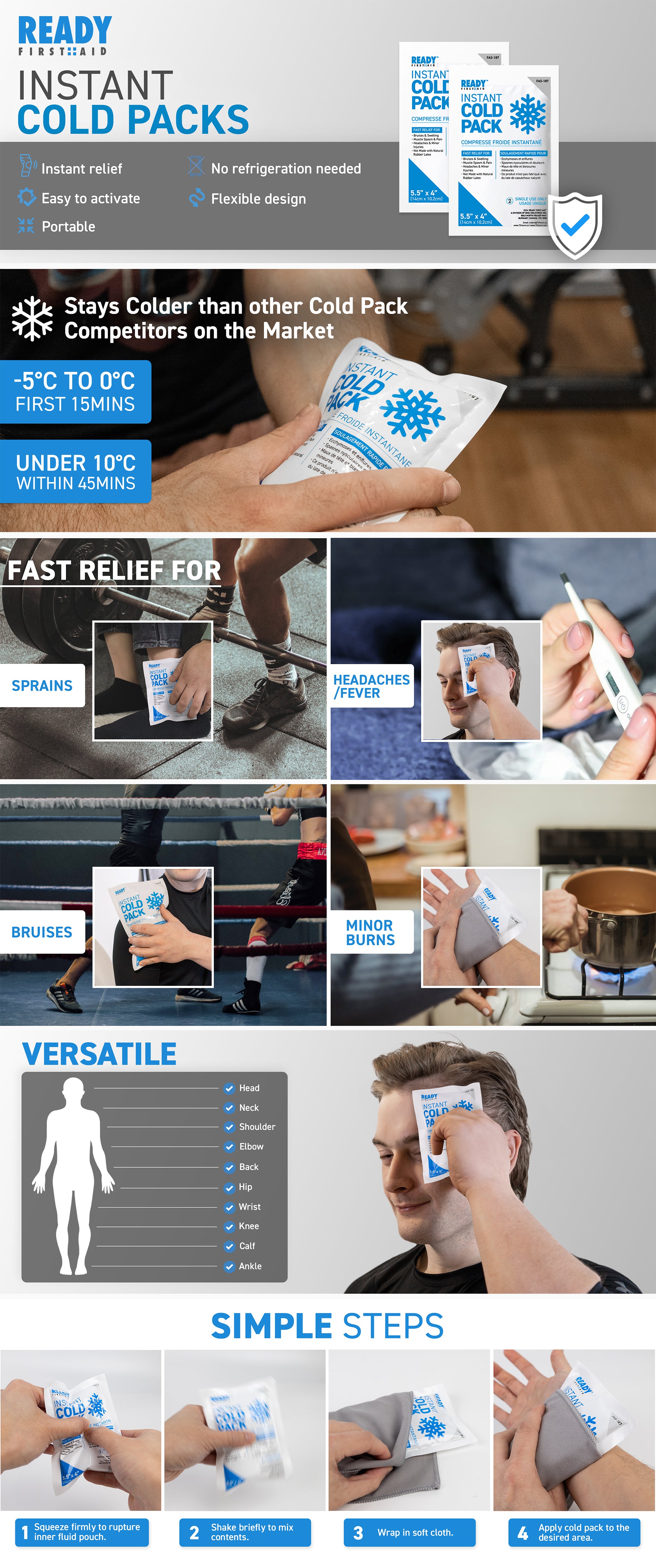 The Ready First Aid Instant Cold Pack is easy activated and ready to use for instant cold therapy for emergency situations. The instant ice pack provides fast relief for bruises, swelling, muscle spasm, pain, headaches & minor injuries. Ice packs are a very effective and extremely easy to use first aid tool.