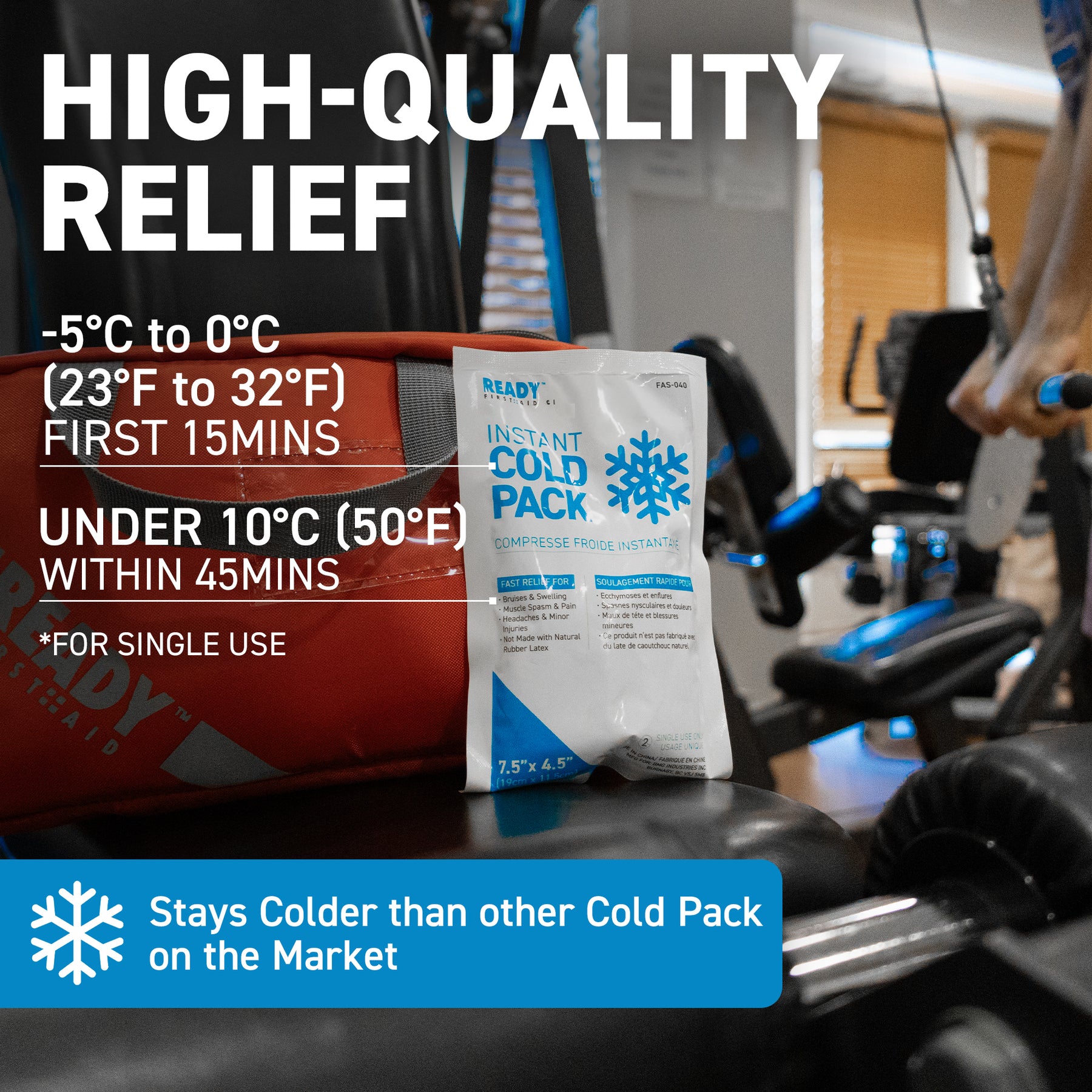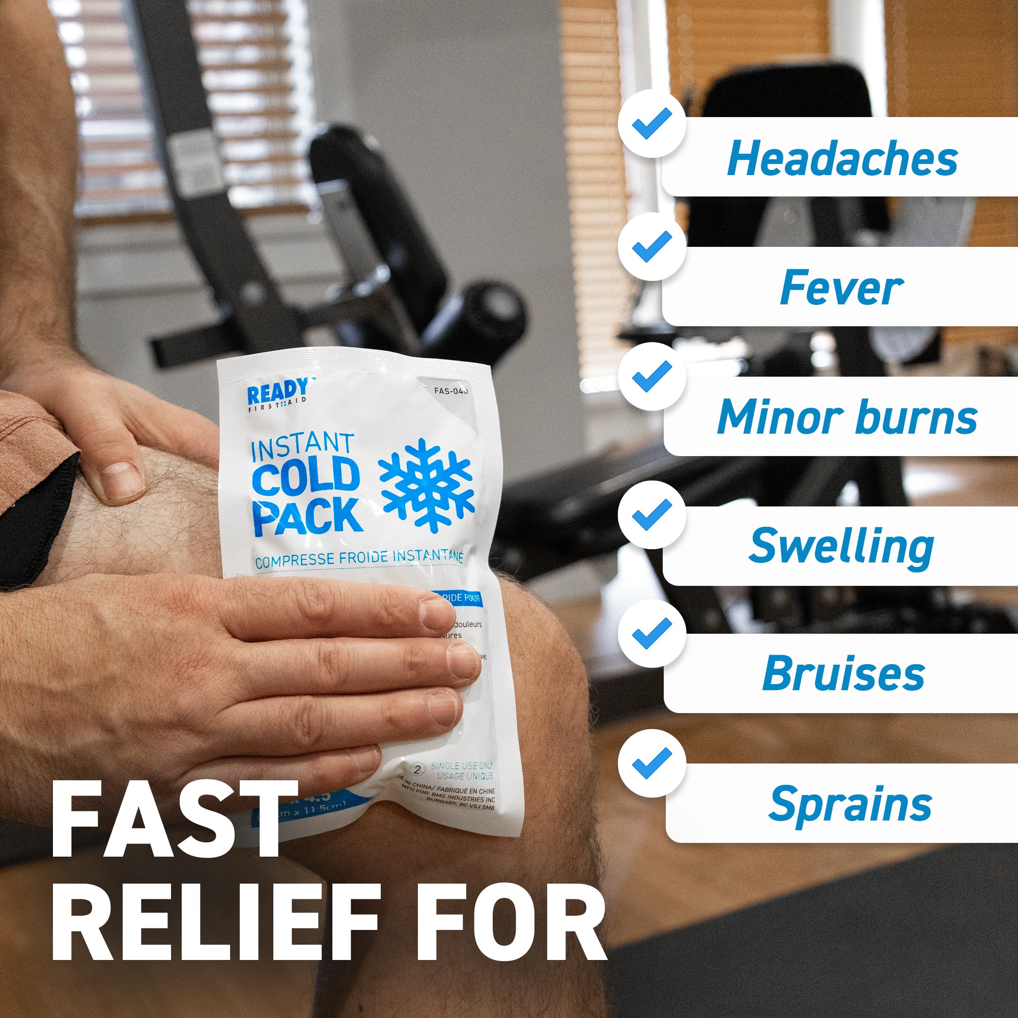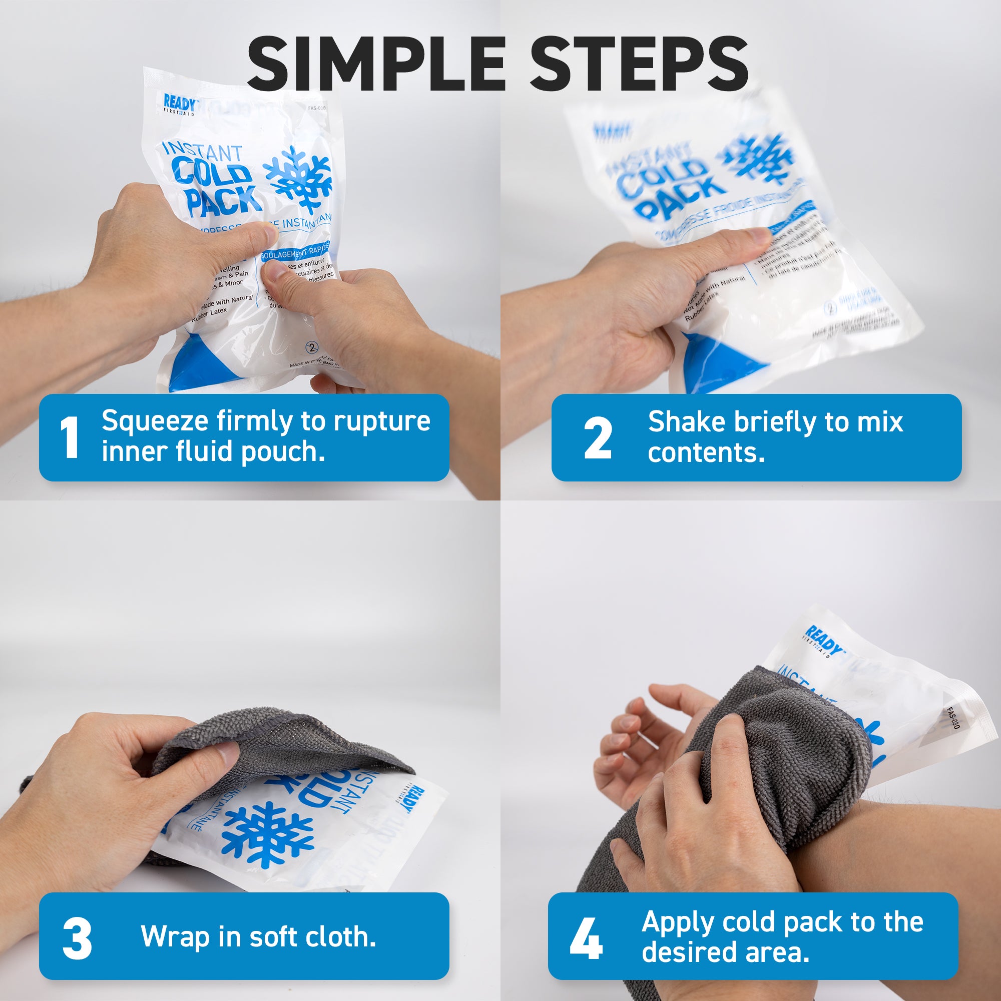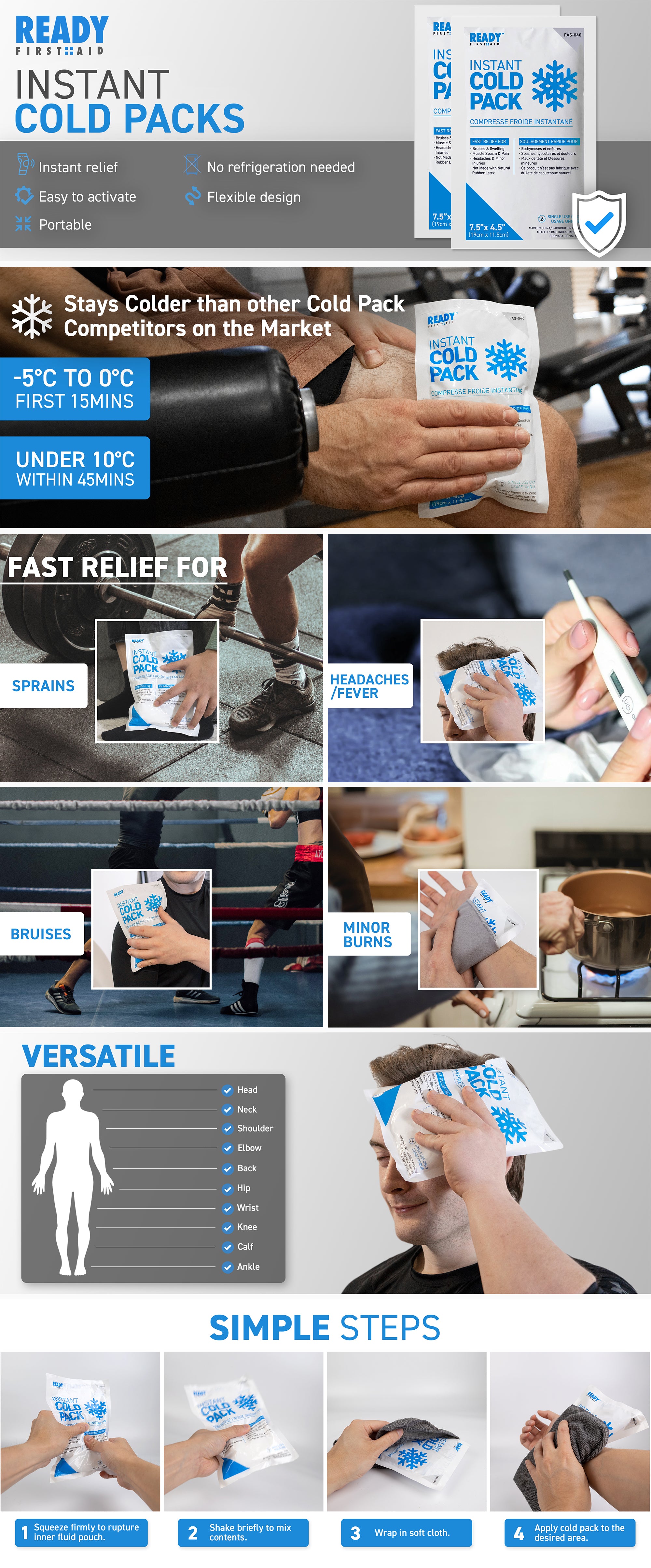 The Ready First Aid Instant Cold Pack is easy activated and ready to use for instant cold therapy for emergency situations. The instant ice pack provides fast relief for bruises, swelling, muscle spasm, pain, headaches & minor injuries. Ice packs are a very effective and extremely easy to use first aid tool.