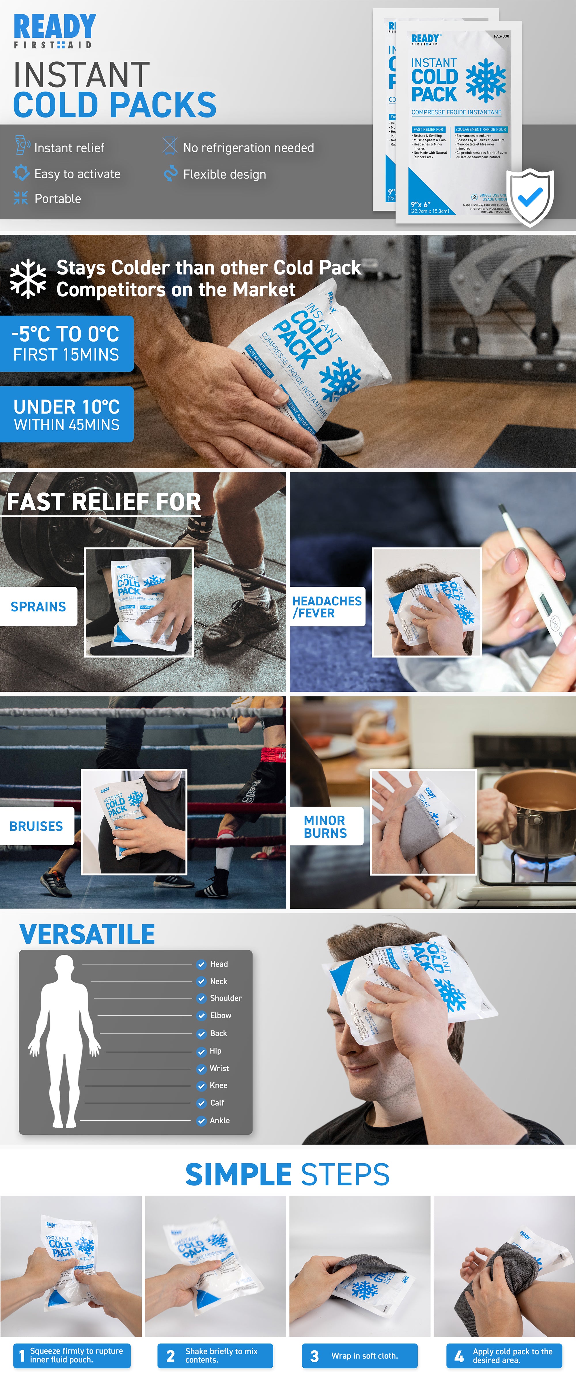 The Ready First Aid Instant Cold Pack is easy activated and ready to use for instant cold therapy for emergency situations. The instant ice pack provides fast relief for bruises, swelling, muscle spasm, pain, headaches & minor injuries. Ice packs are a very effective and extremely easy to use first aid tool.