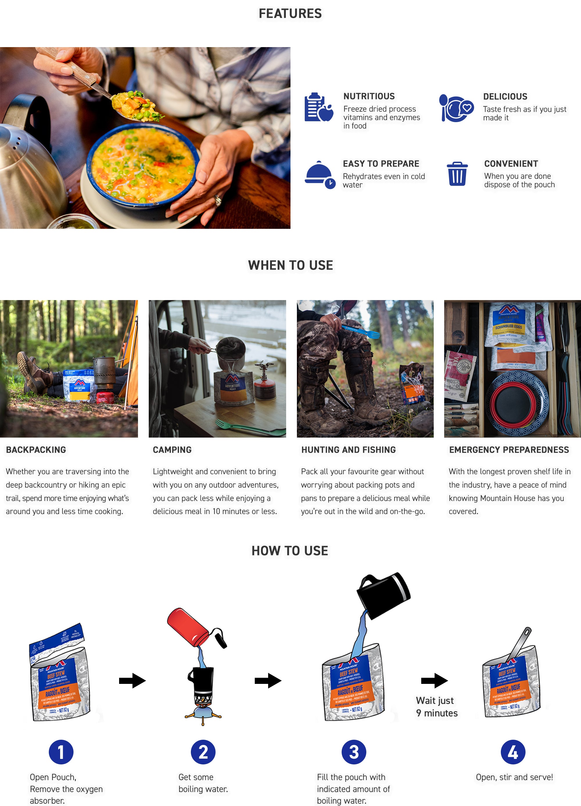 For nearly 50 years, consumers have continued to choose Mountain House as their favourite brand of freeze-dried food for on-the-go adventures, emergency preparedness and survival. With just-add-water convenience, easy no-mess cleanup and home-cooked flavours, Mountain House is the best freeze-dried camping, backpacking, hiking and emergency preparedness food money can buy!
