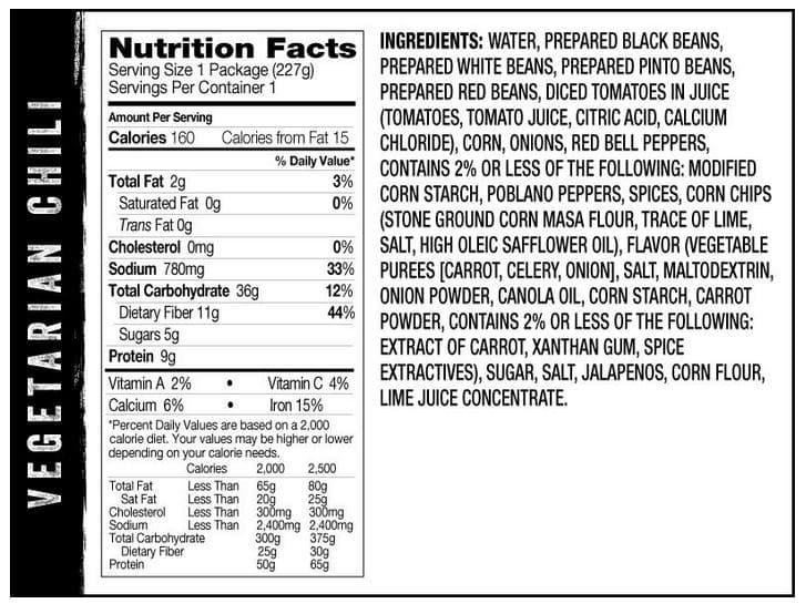Water, Black Beans, White Beans, Pinto Beans, Red Beans, Diced Tomatoes (Tomatoes, Tomato Juice, Citric Acid, Calcium Chloride), Corn, Onions, Red Bell Peppers, Modified Cornstarch, Poblano Peppers, Spices, Tortilla Chips (Stone Ground Corn Masa Flour, Canola, And/or Safflower And/or Soybean Oils, Salt), Mirepoix Base (Pureed) Carrots, Celery And Onion, Salt, Maltodextrin, Onion Powder, Canola Oil, Cornstarch, Carrot Powder, Carrot Extract, Xanthan Gum, Spice Extracts), Sugar, Salt, Jalapeno Peppers, Corn Flour, Lime Juice Concentrate. Contains: Soy,