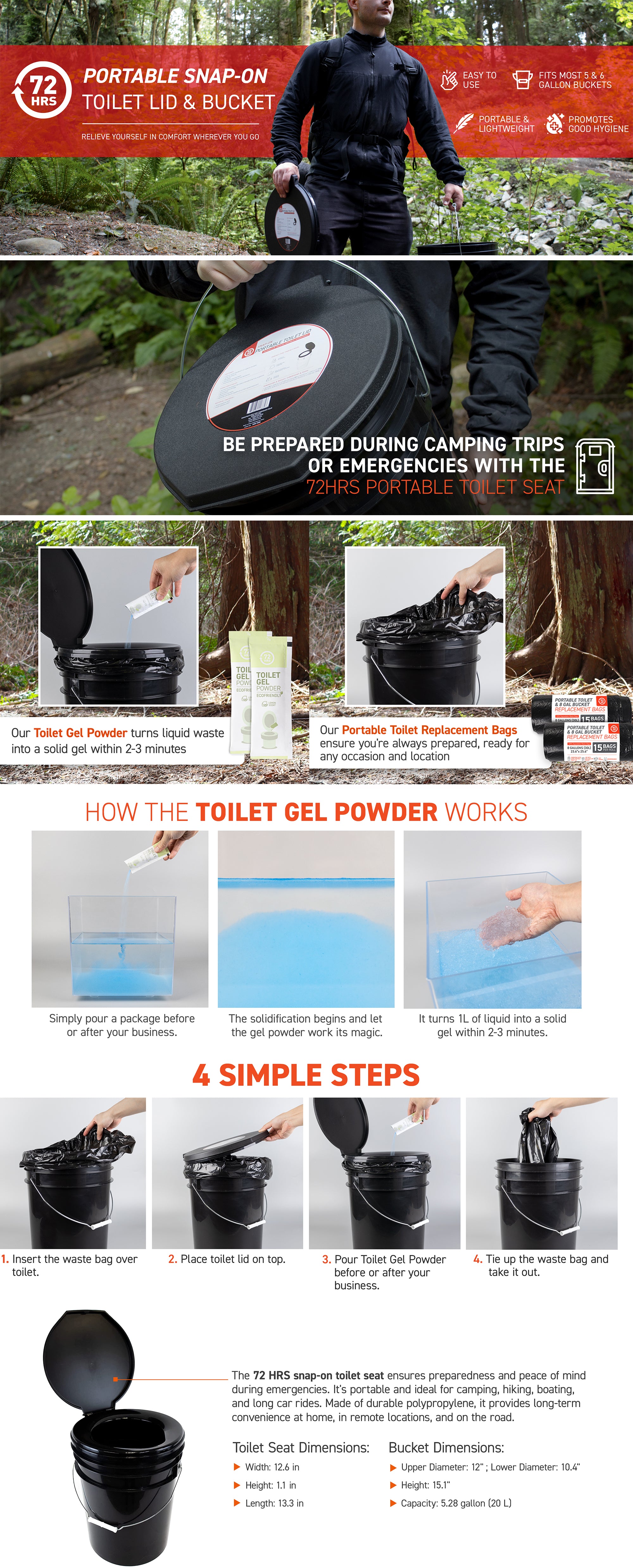 Our standard 5-gallon high-quality food-grade grab bucket is the strong base for this portable toilet which comes with a toilet lid conversion that makes the bucket into a portable toilet. It is great for camping and emergencies when running water is unavailable. The portable toilet works hand in hand with the toilet bag with deodorant which helps keep the inside of the bucket clean and able for use even after you've done your business.