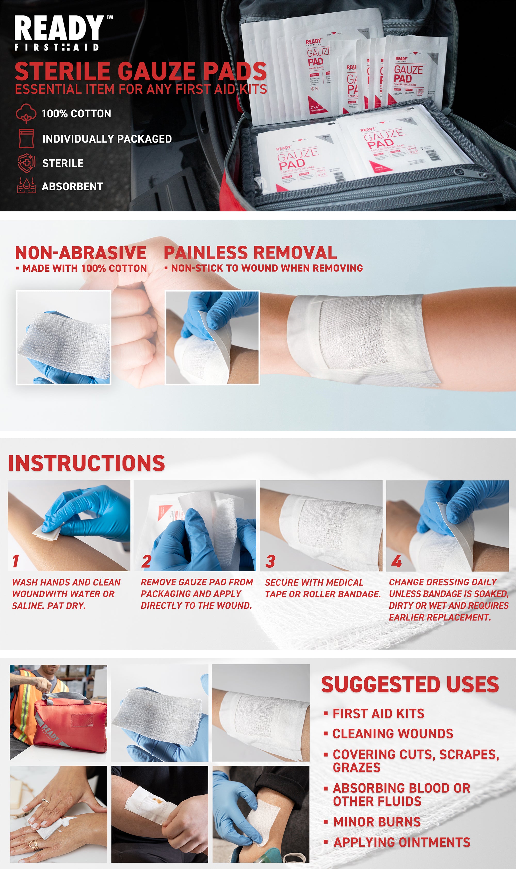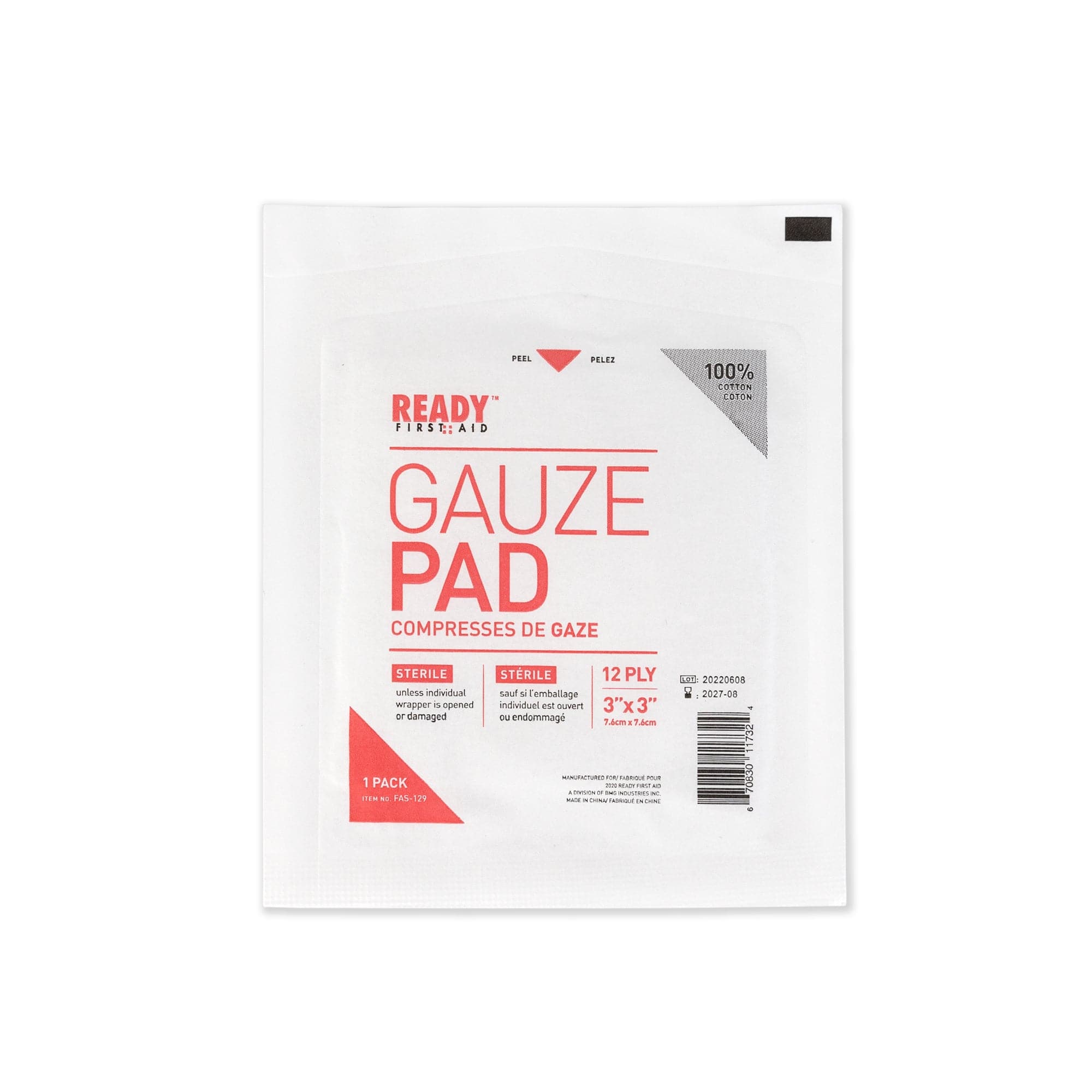 The Ready First Aid Gauze Pads are made with 100% cotton and are 12-ply. Each gauze pad is individually wrapped and sterile so that the gauze can be applied to an open wound directly. An essential item and great for treating minor cuts and scrapes.