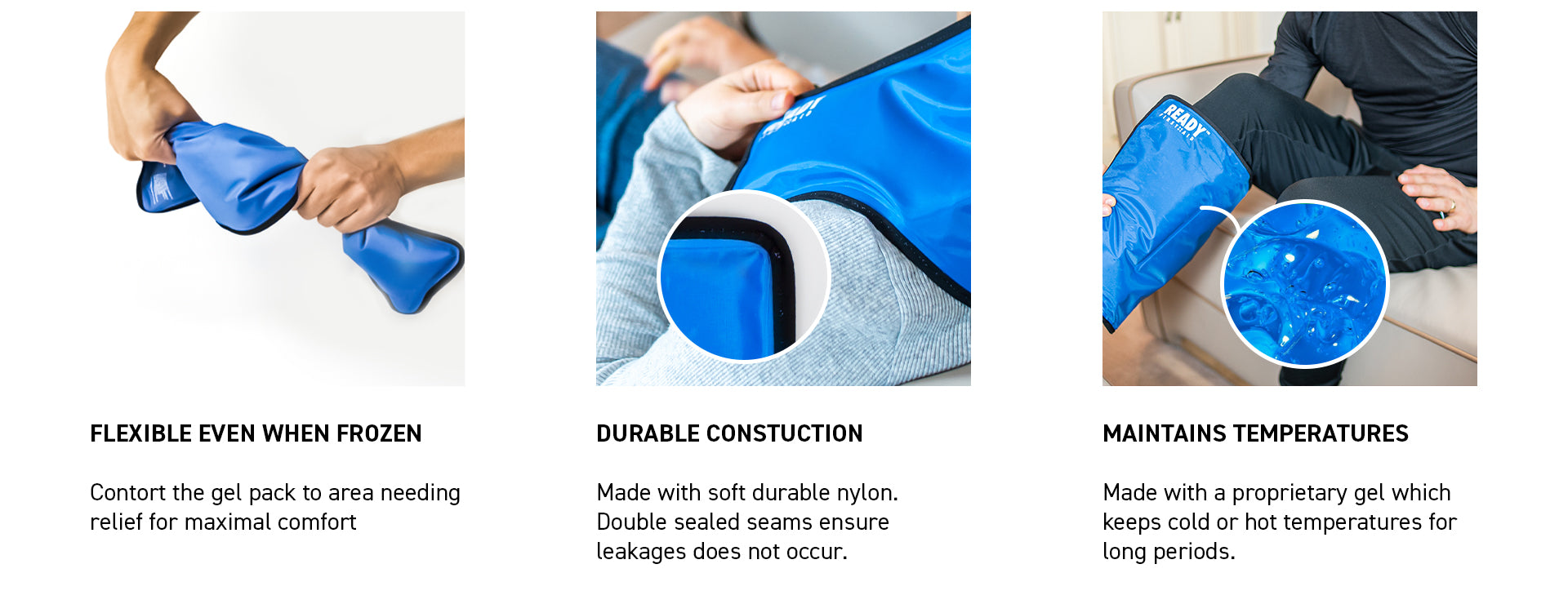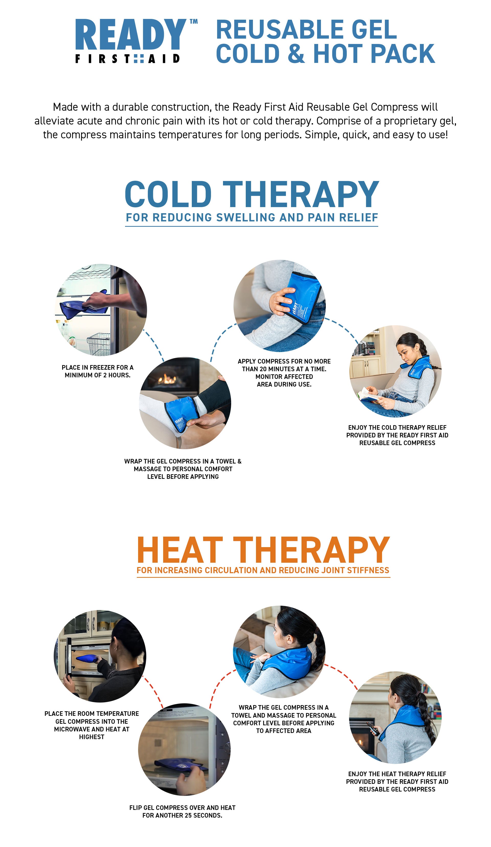 1) Place in freezer for a minimum of 2 hours. 2) Massage and wrap the gel compress to personal comfort level before applying to affected area. Do not apply gel compress directly on skin. Wrap in a towel. 3) Apply compress no more than 20 minutes at a time. Monitor affected area during application to prevent frostbite. If too cold, wrap the gel compress with additional towel. 4) After use, wipe gel compress dry before storing in the freezer for future use.
